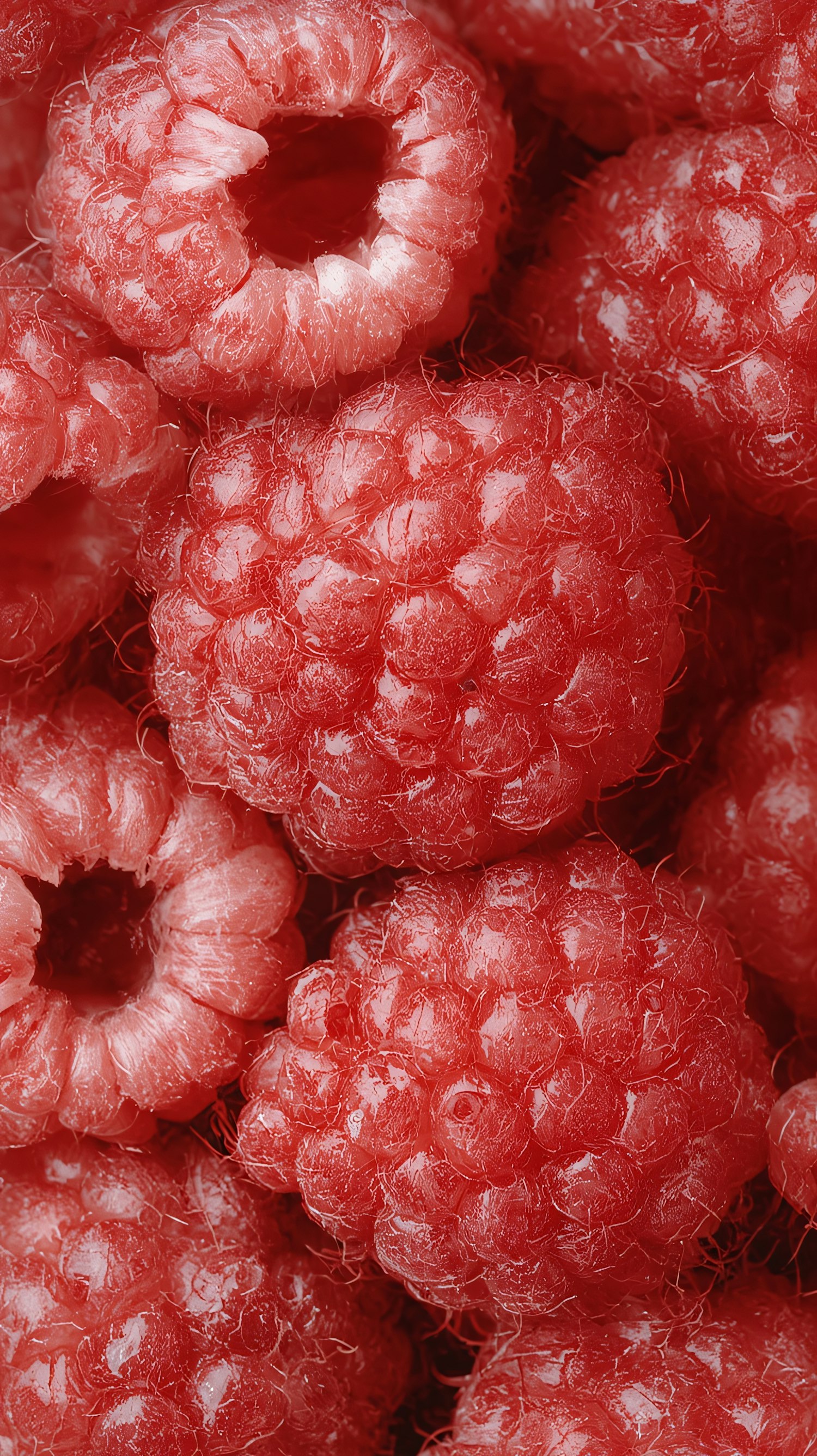 Close-up of fresh, vibrant red raspberries, highlighting their detailed texture and natural glossiness.