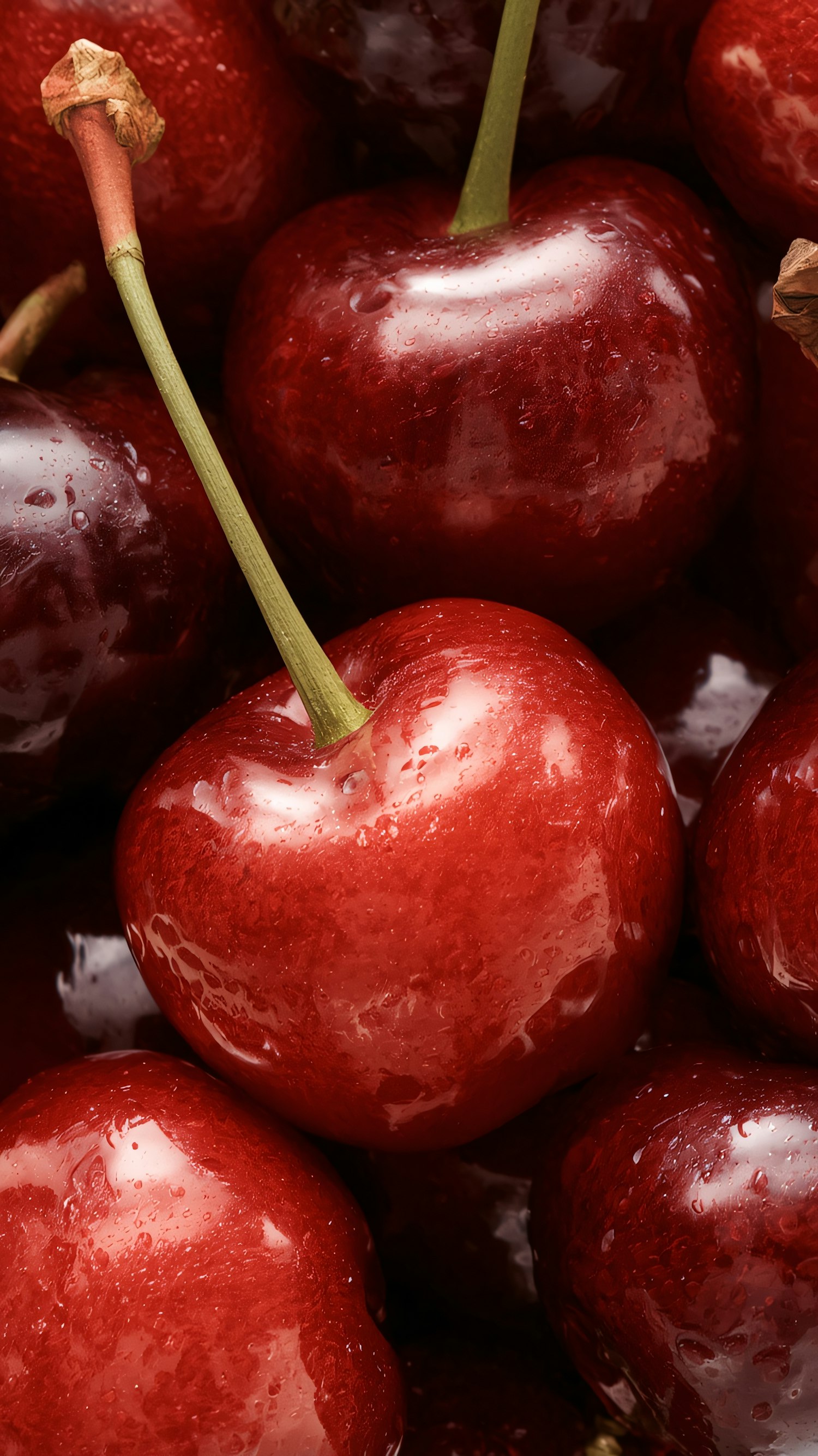 Close-up of fresh, glossy red cherries with water droplets, showcasing their vibrant color and natural texture.