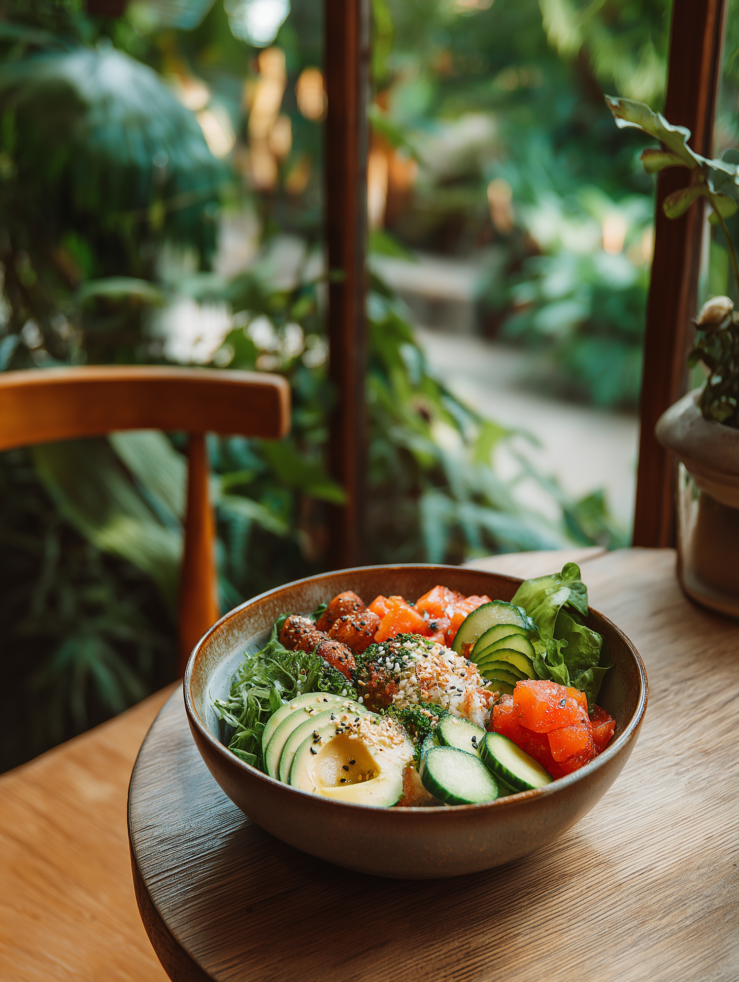A fresh and colorful bowl of avocado, cucumber, and salmon on a wooden table, set against a lush green background.