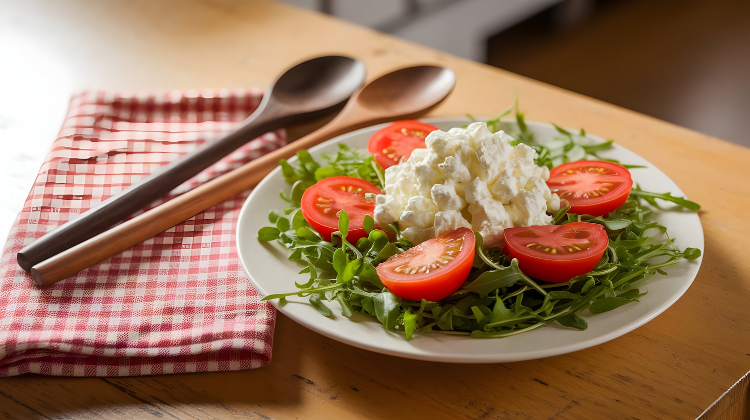 Fresh arugula salad with ripe tomato halves and creamy cottage cheese, served with wooden spoons on a rustic table.
