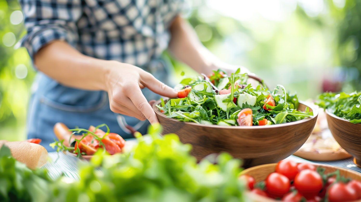 Fresh salad preparation with arugula, cucumbers, and tomatoes in a wooden bowl, set in a bright outdoor setting.