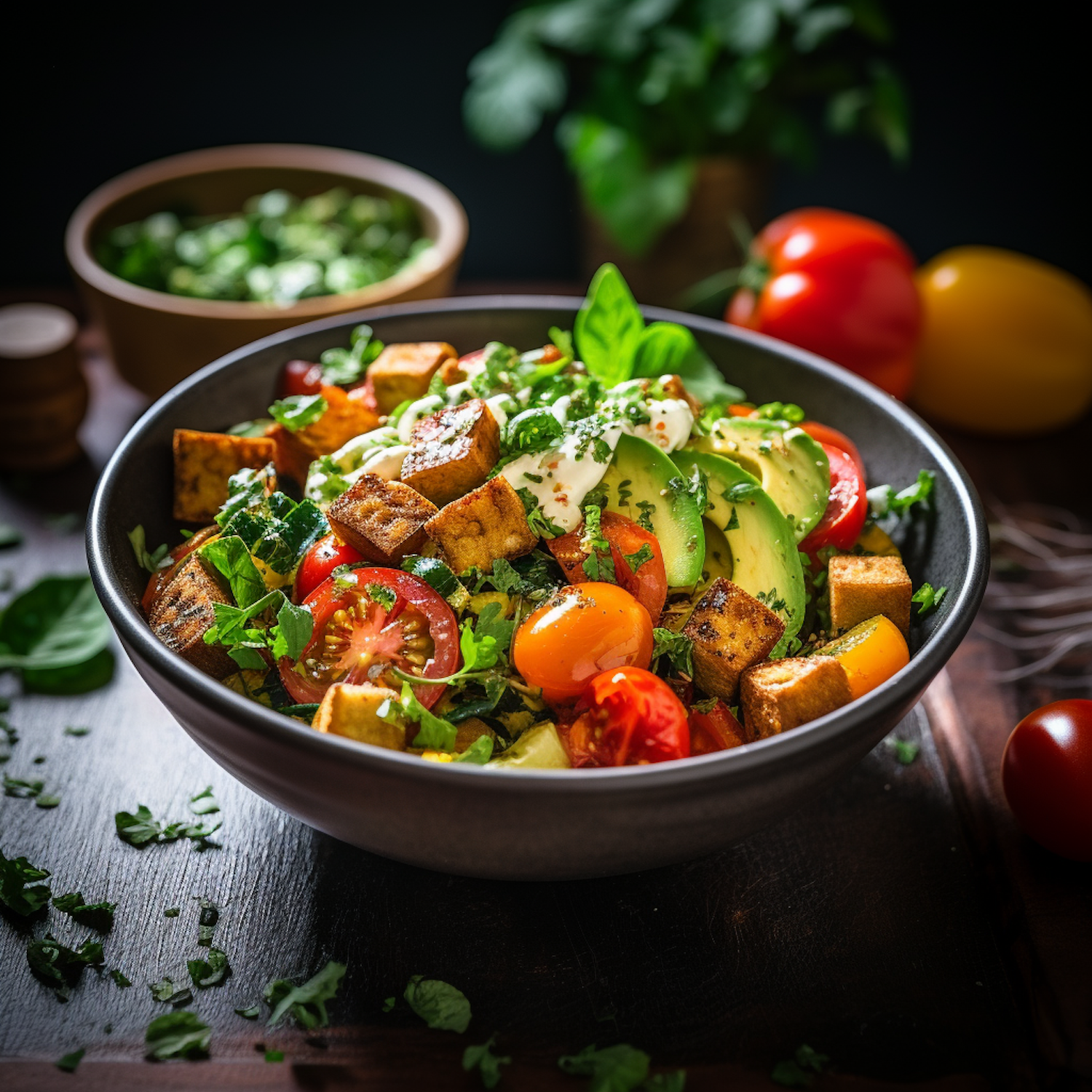 Colorful salad with grilled tofu, avocado, cherry tomatoes, and fresh herbs in a dark bowl, topped with creamy dressing.