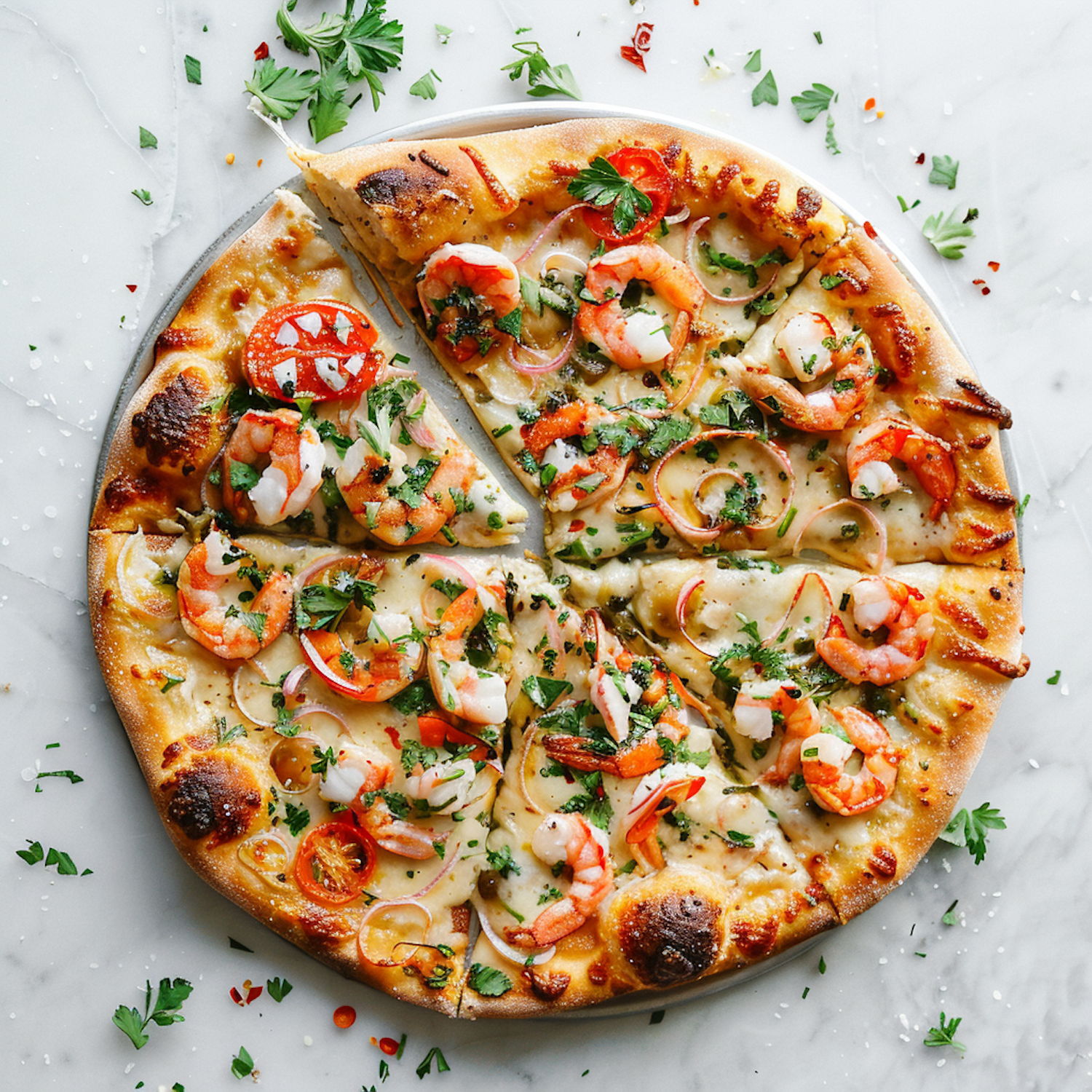 Mouthwatering seafood pizza topped with shrimp, red onions, and parsley on a golden crust, set on a marble surface.