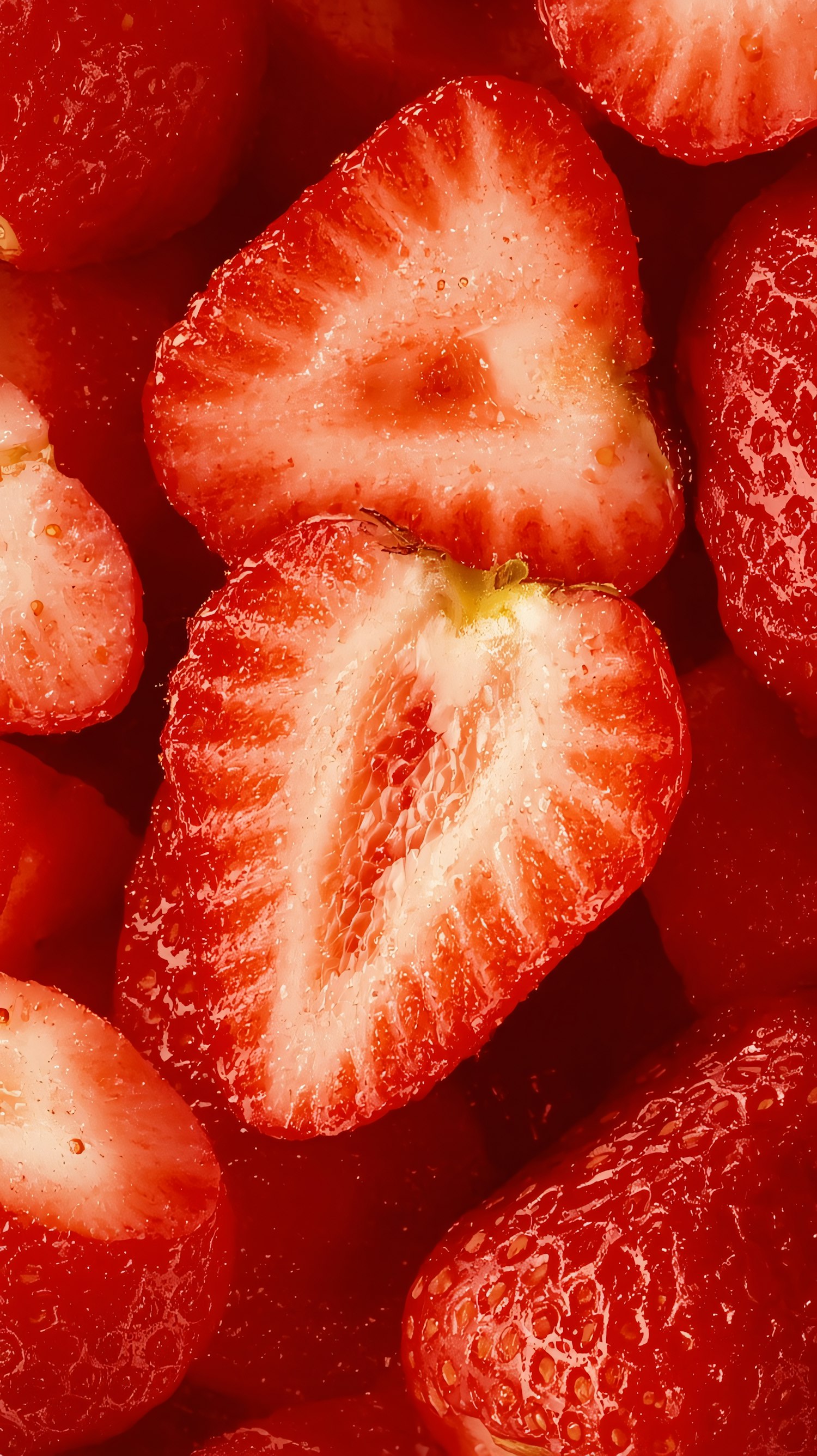 Close-up of fresh, juicy strawberries, some halved to reveal their vibrant red interior and glistening with moisture.