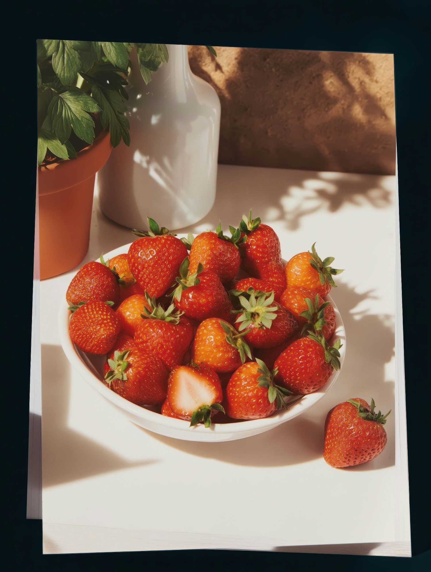 A bowl of fresh, ripe strawberries on a white surface, with a vase and potted plant in the background. Perfect for a summer vibe.