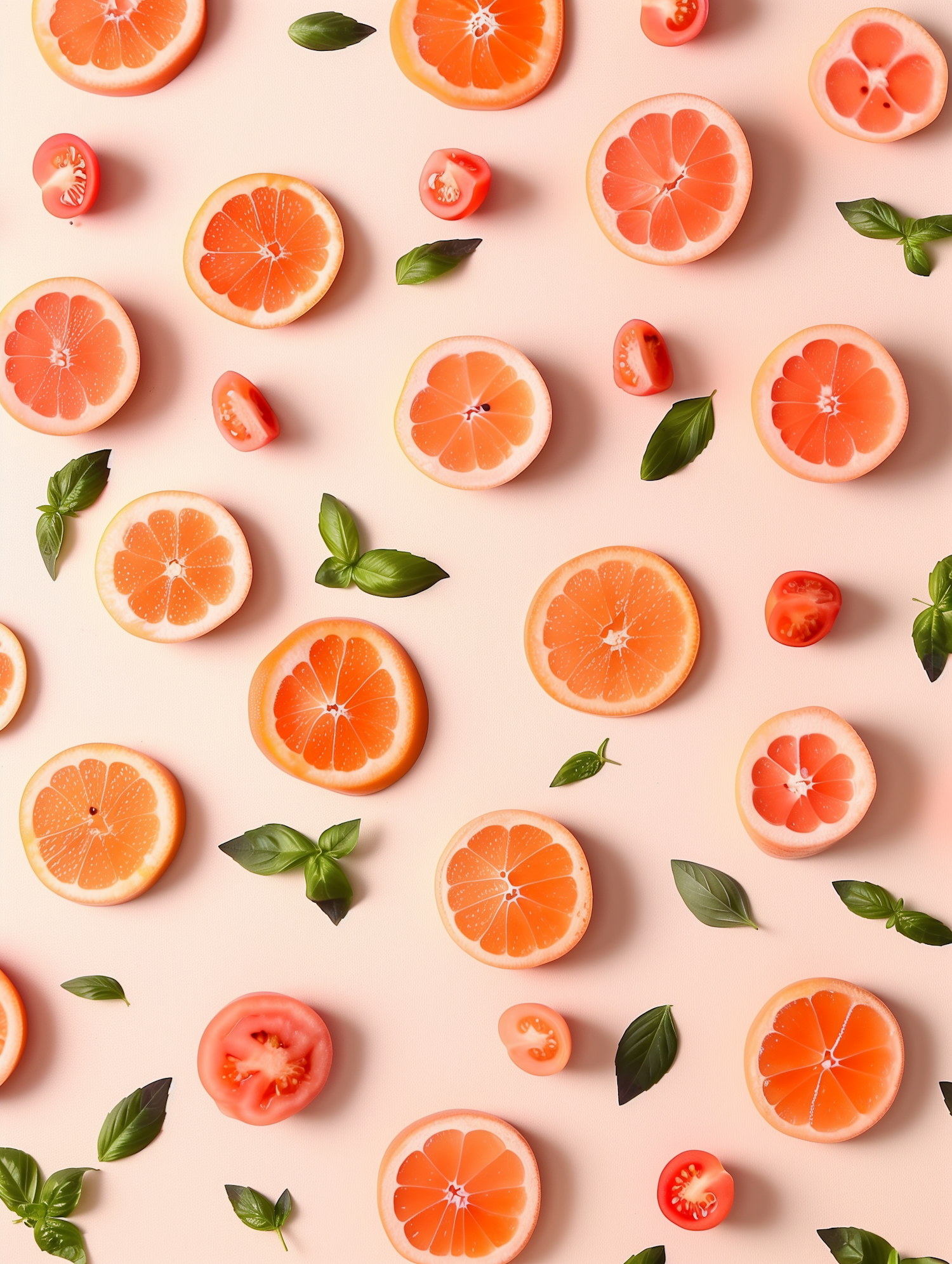 Bright flat-lay of grapefruit slices, cherry tomatoes, and basil leaves on a beige background. Perfect for fresh, summery vibes.