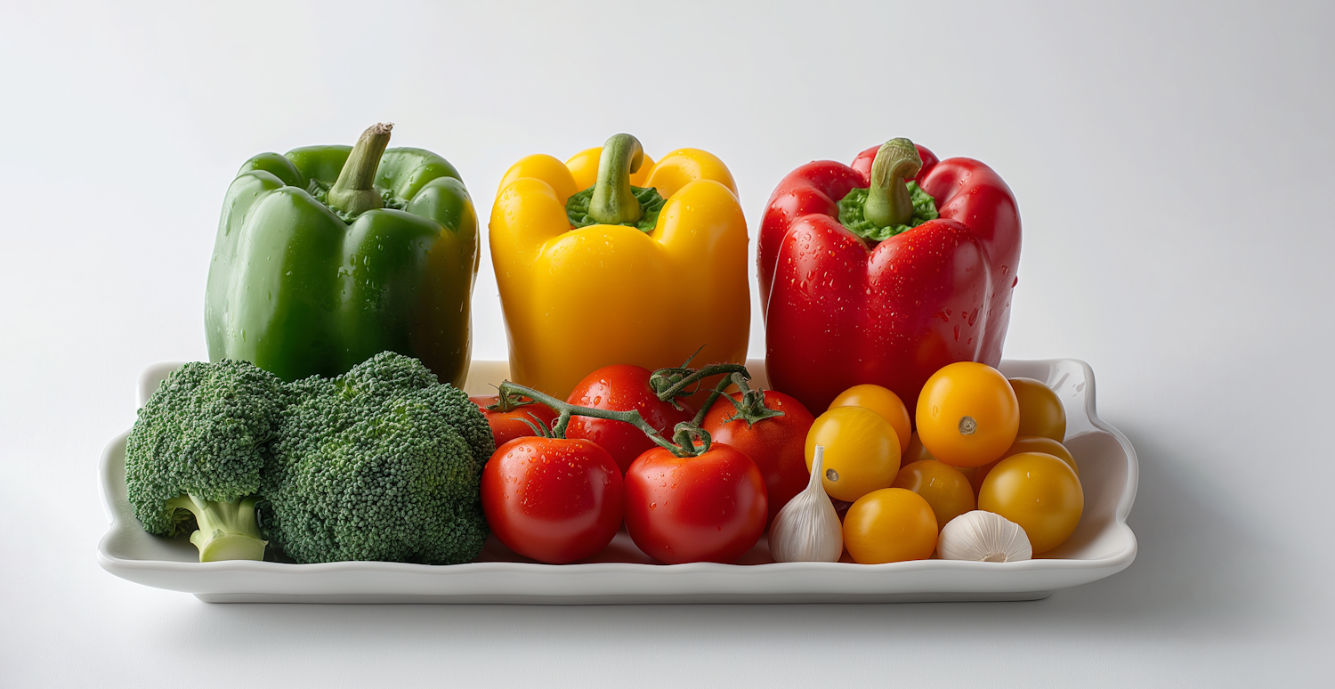 Colorful vegetables on a platter: green, yellow, red peppers, tomatoes, broccoli, and garlic on a white background.