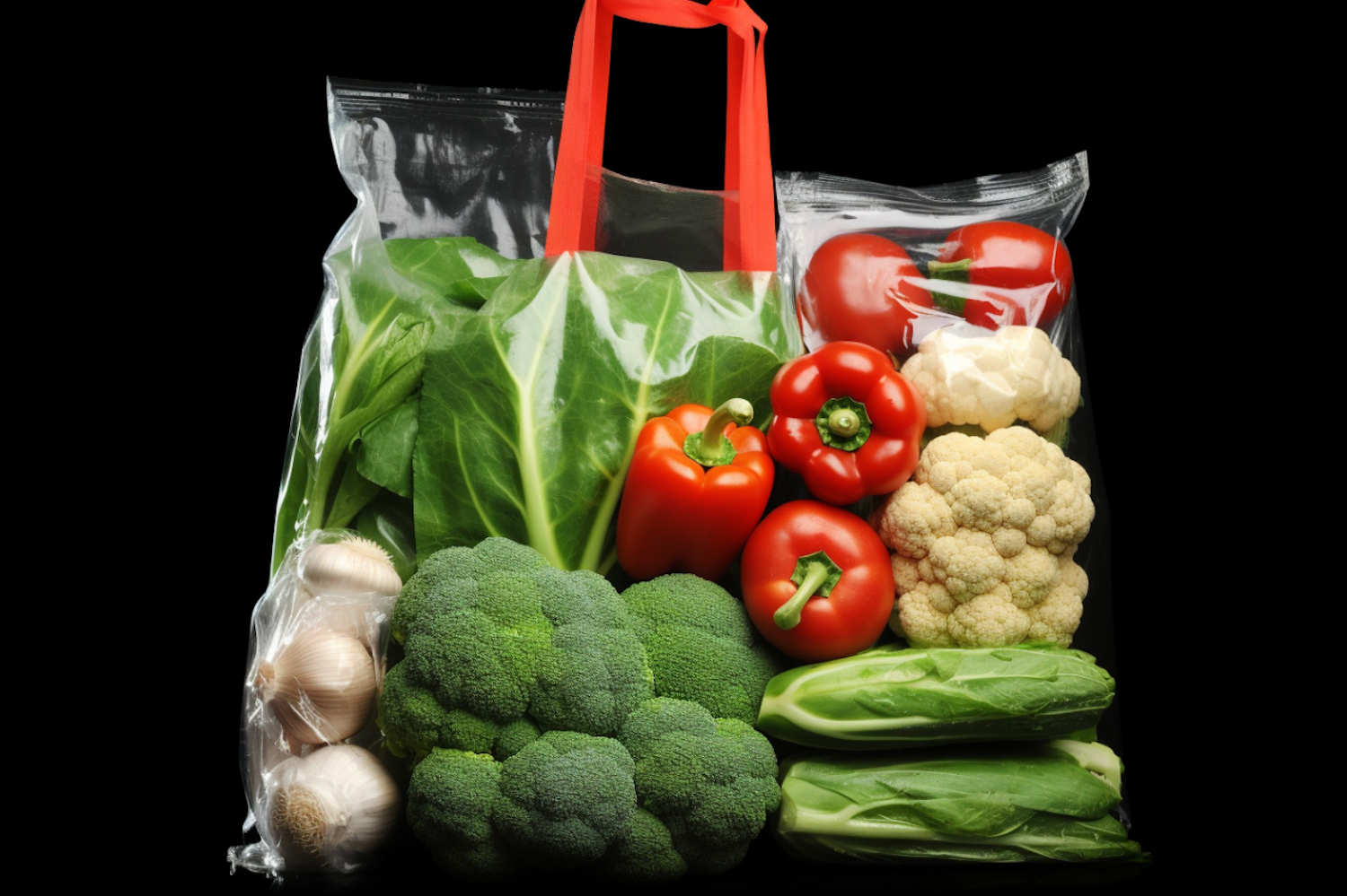 A clear bag filled with fresh vegetables like spinach, bell peppers, and broccoli against a black background.