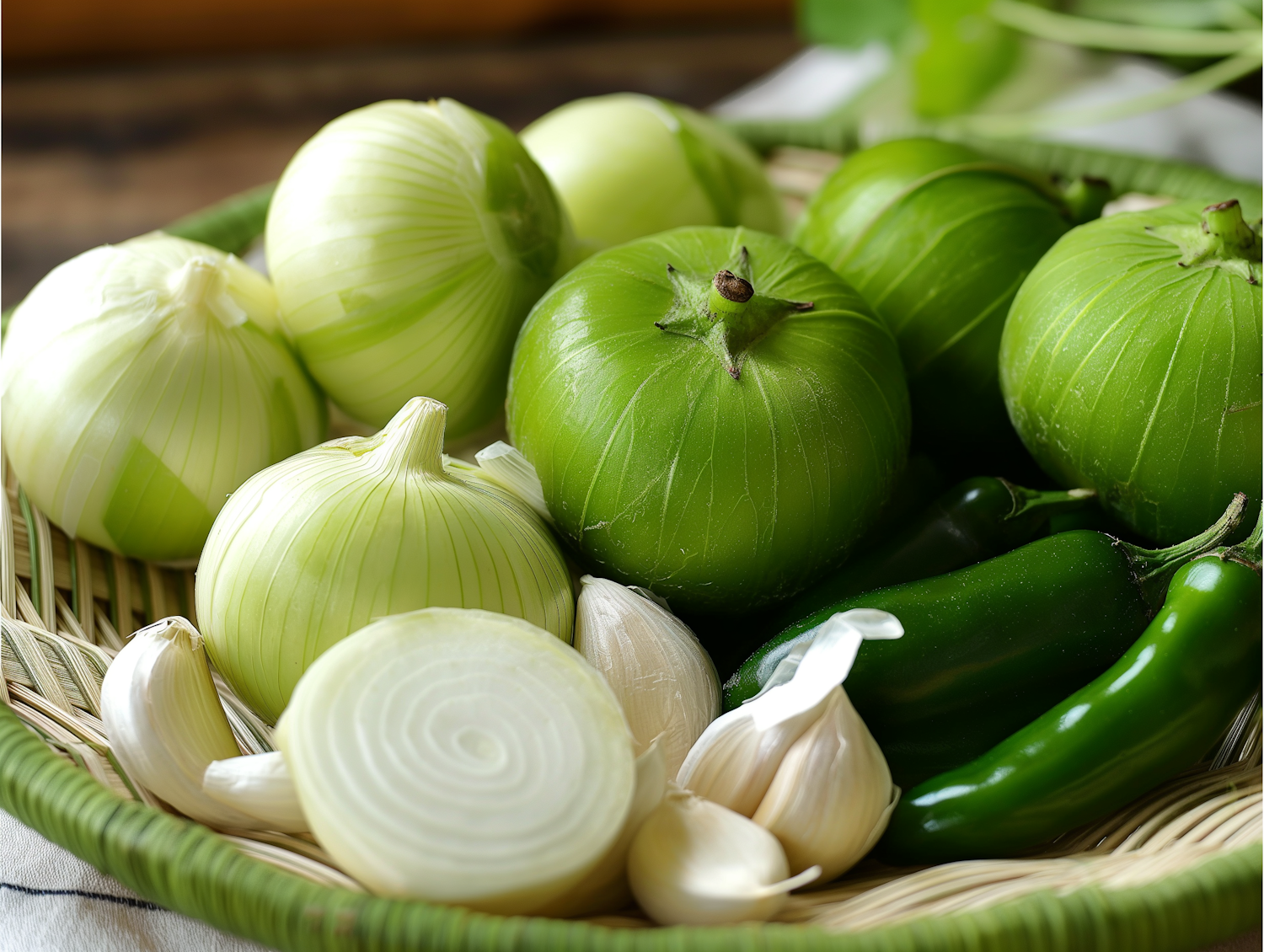A basket of fresh green tomatillos, white onions, garlic, and jalapeños, showcasing vibrant colors and textures.