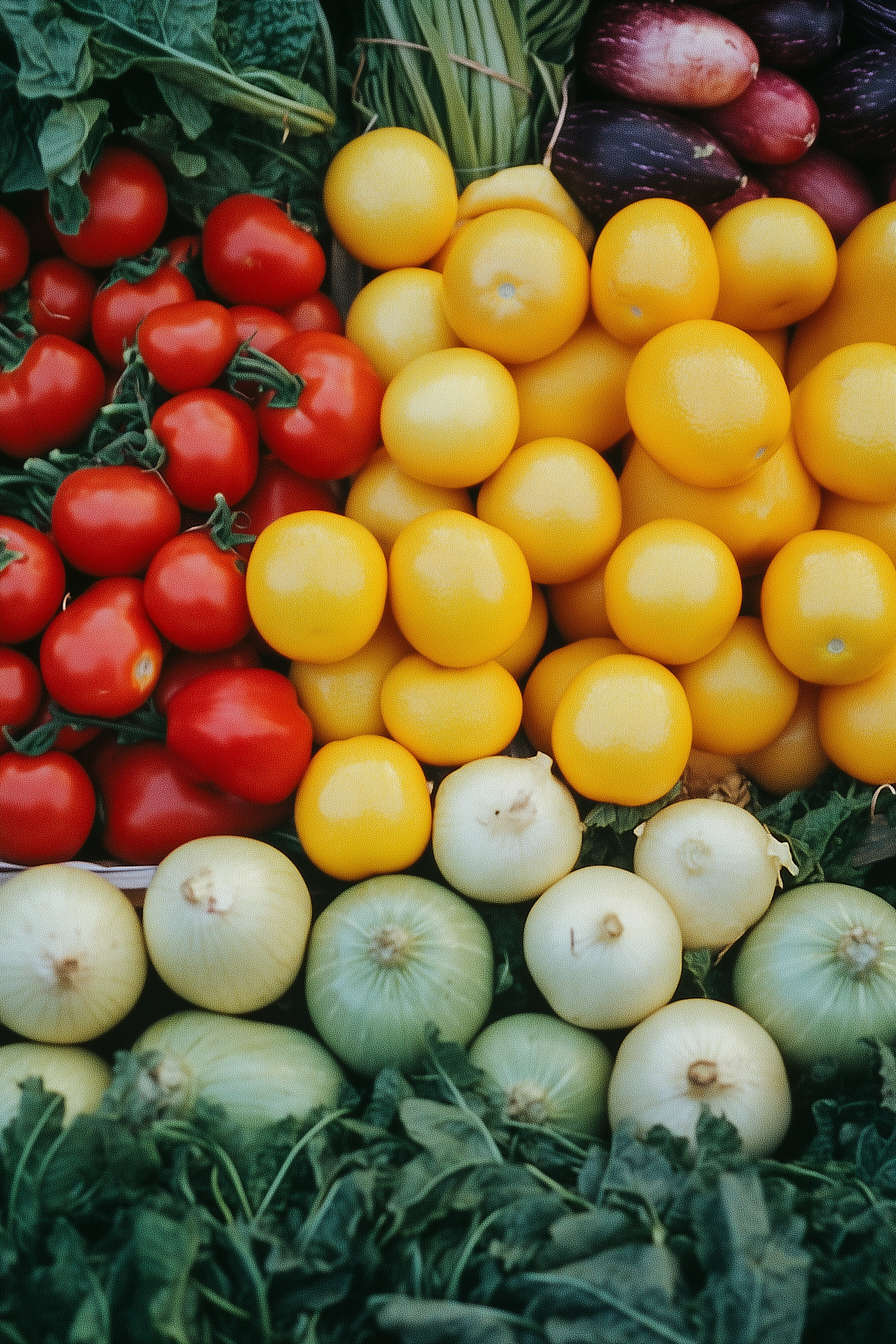 Fresh vegetables on display: red tomatoes, yellow tomatoes, onions, leafy greens, and eggplants create a colorful and vibrant arrangement.