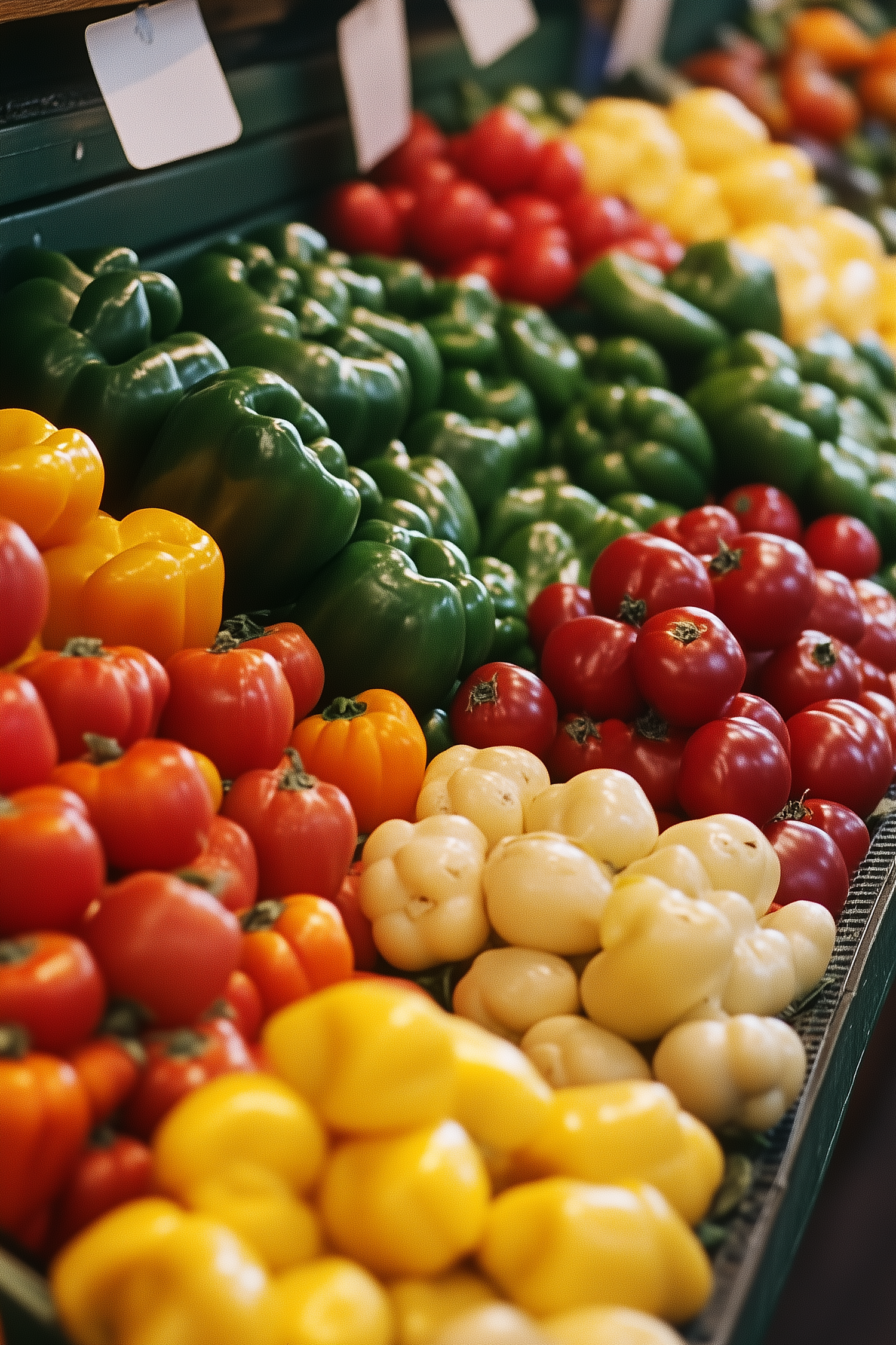 Colorful rows of fresh bell peppers and tomatoes at a market, showcasing vibrant yellow, red, green, and white hues.