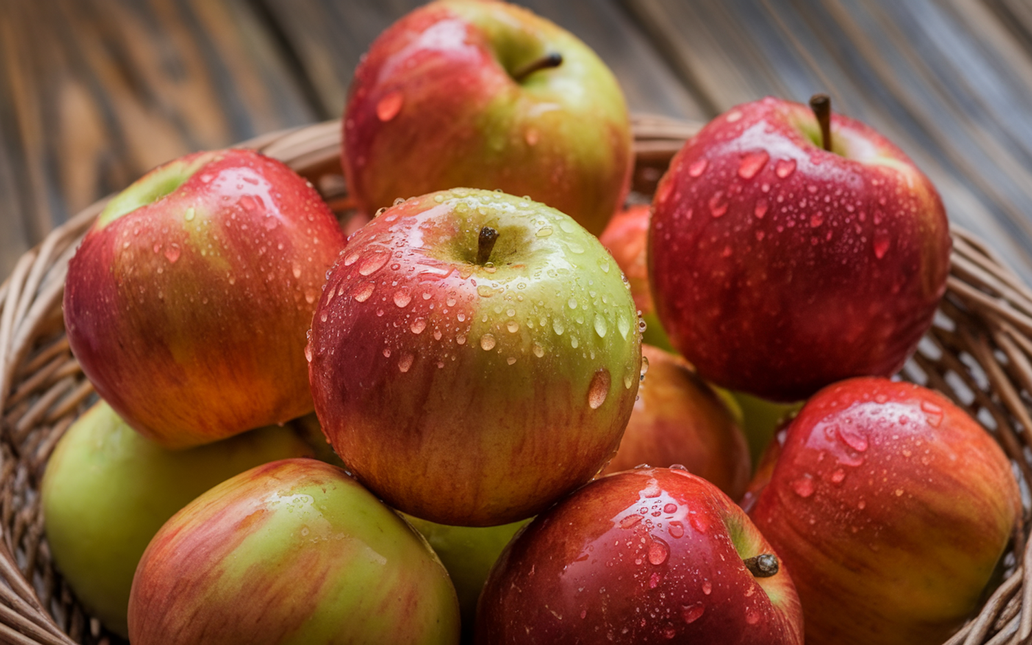 Fresh apples with water droplets in a wicker basket, showcasing vibrant red and green hues against a rustic wooden background.