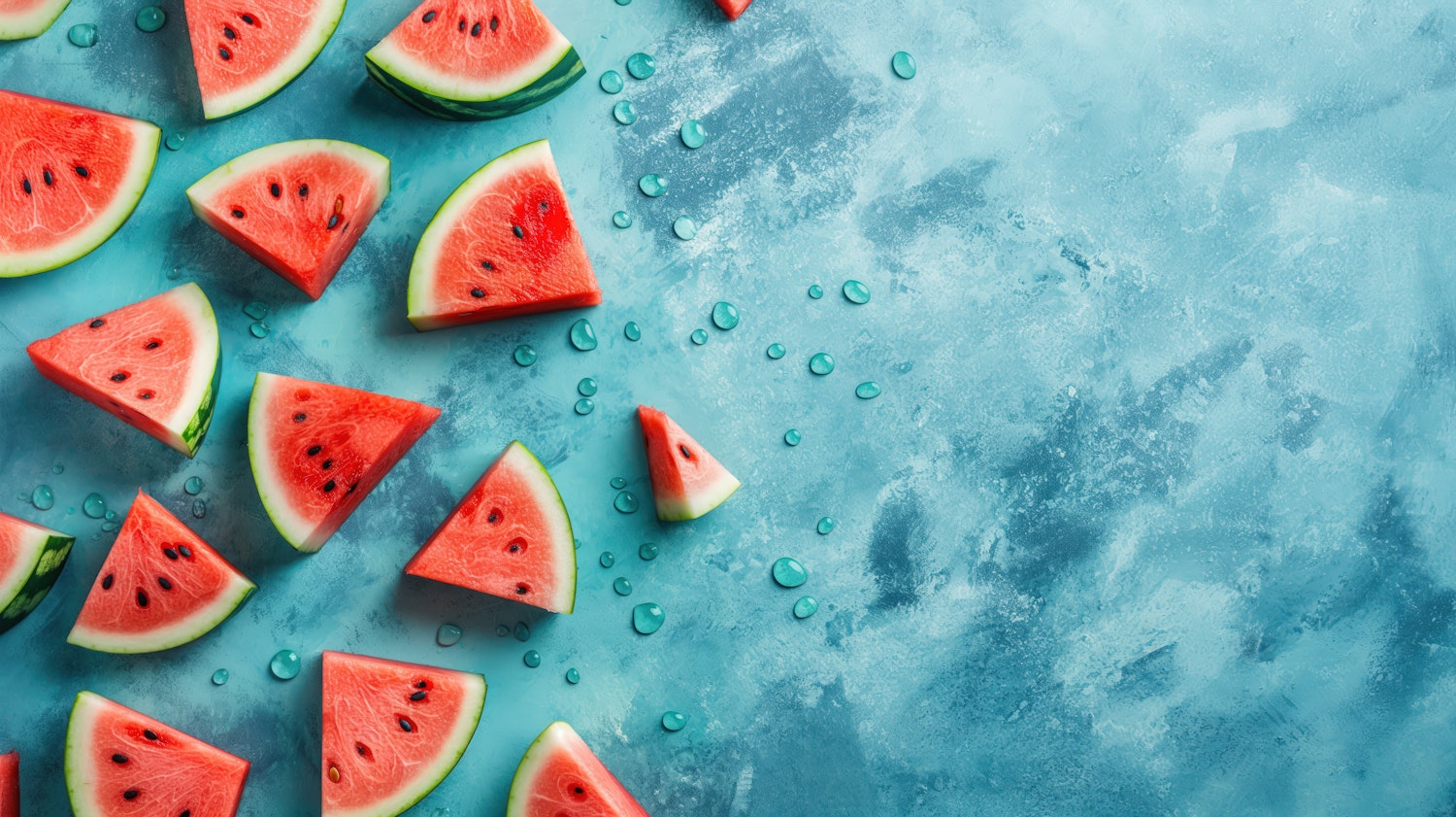 Fresh watermelon slices on a textured blue background with water droplets, creating a vibrant and refreshing summer aesthetic.