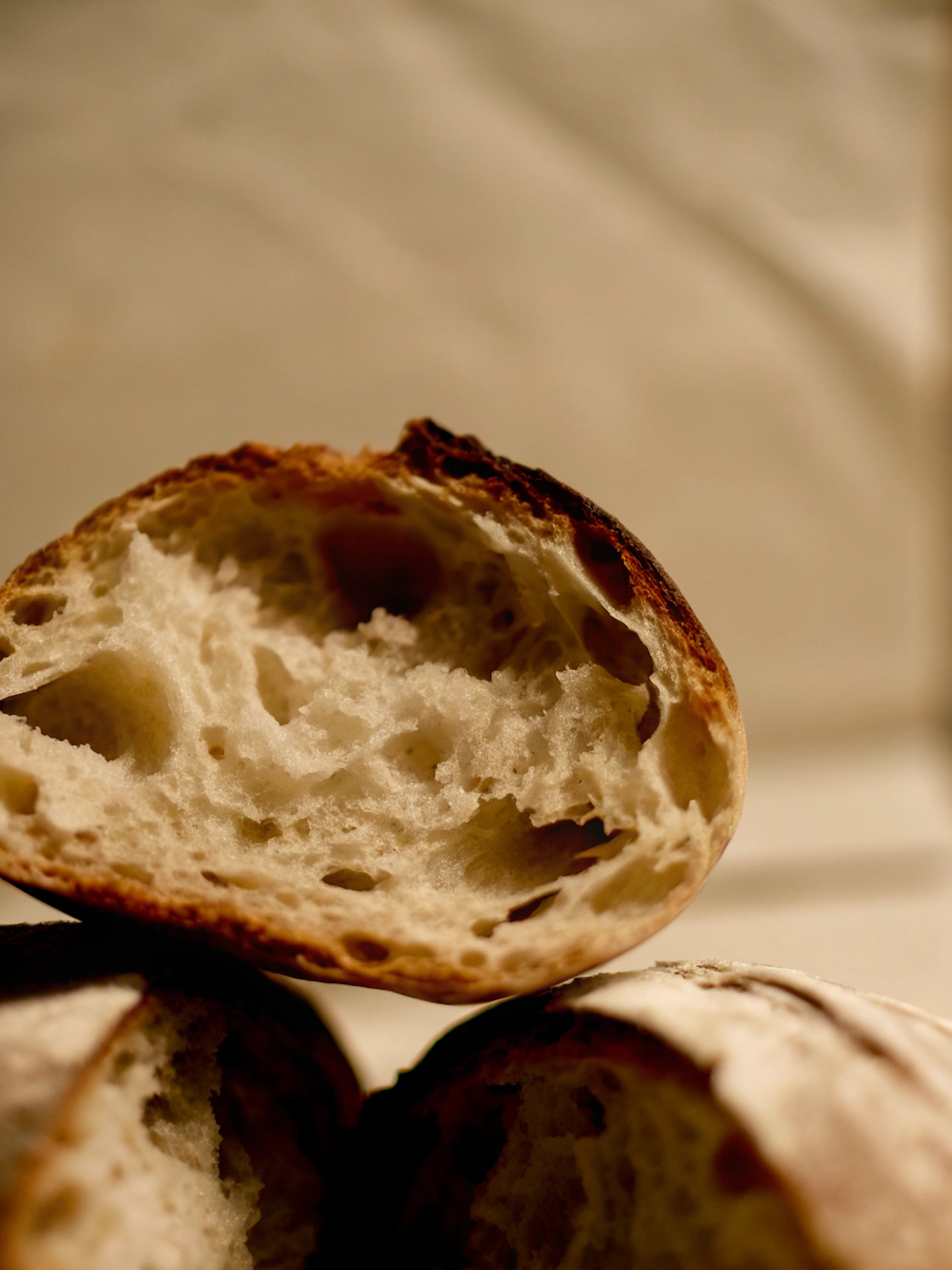 Close-up of a sliced loaf of bread with a golden crust and airy crumb, perfect for showcasing artisanal baking. Warm, inviting tones.