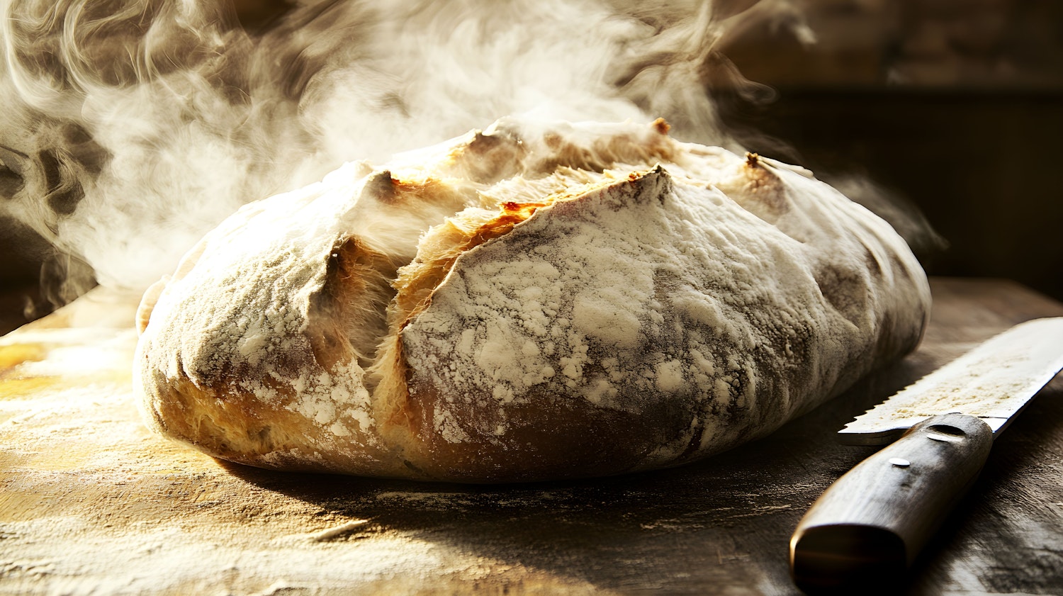 Freshly baked bread with a golden crust and steam rising, next to a serrated knife on a wooden surface.