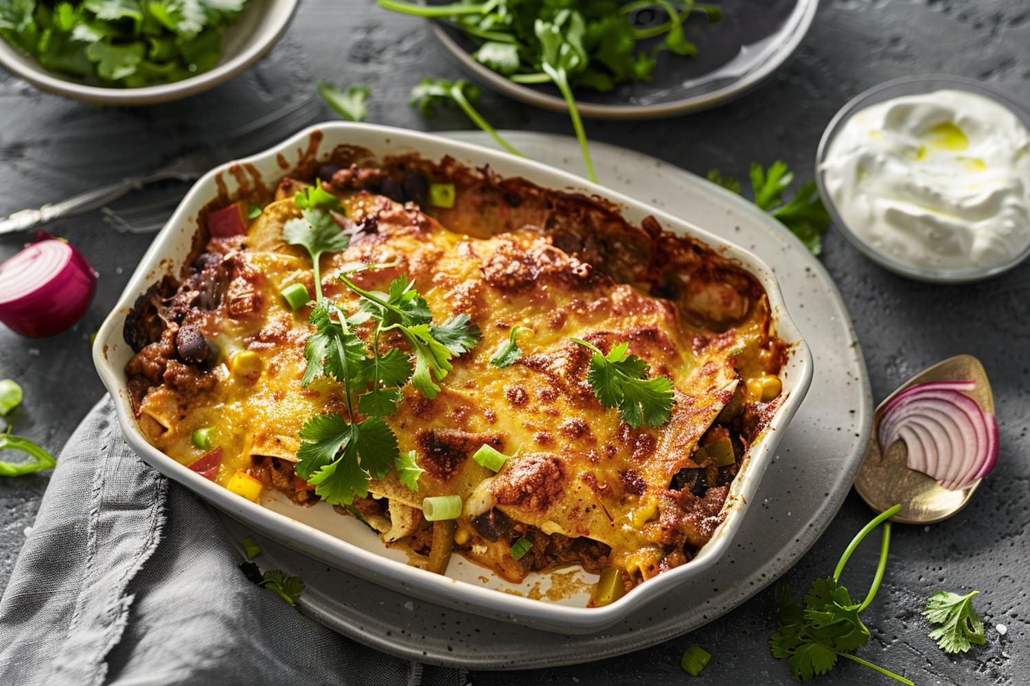 Baked dish with melted cheese, ground meat, beans, and cilantro in a white dish. Served with sour cream and red onions on a gray surface.