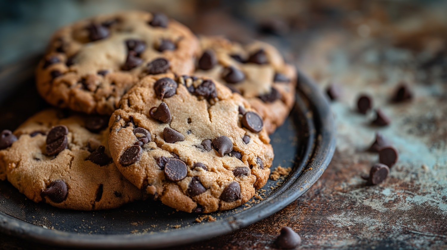 Delicious stack of golden brown chocolate chip cookies on a rustic plate, perfect for a cozy treat.