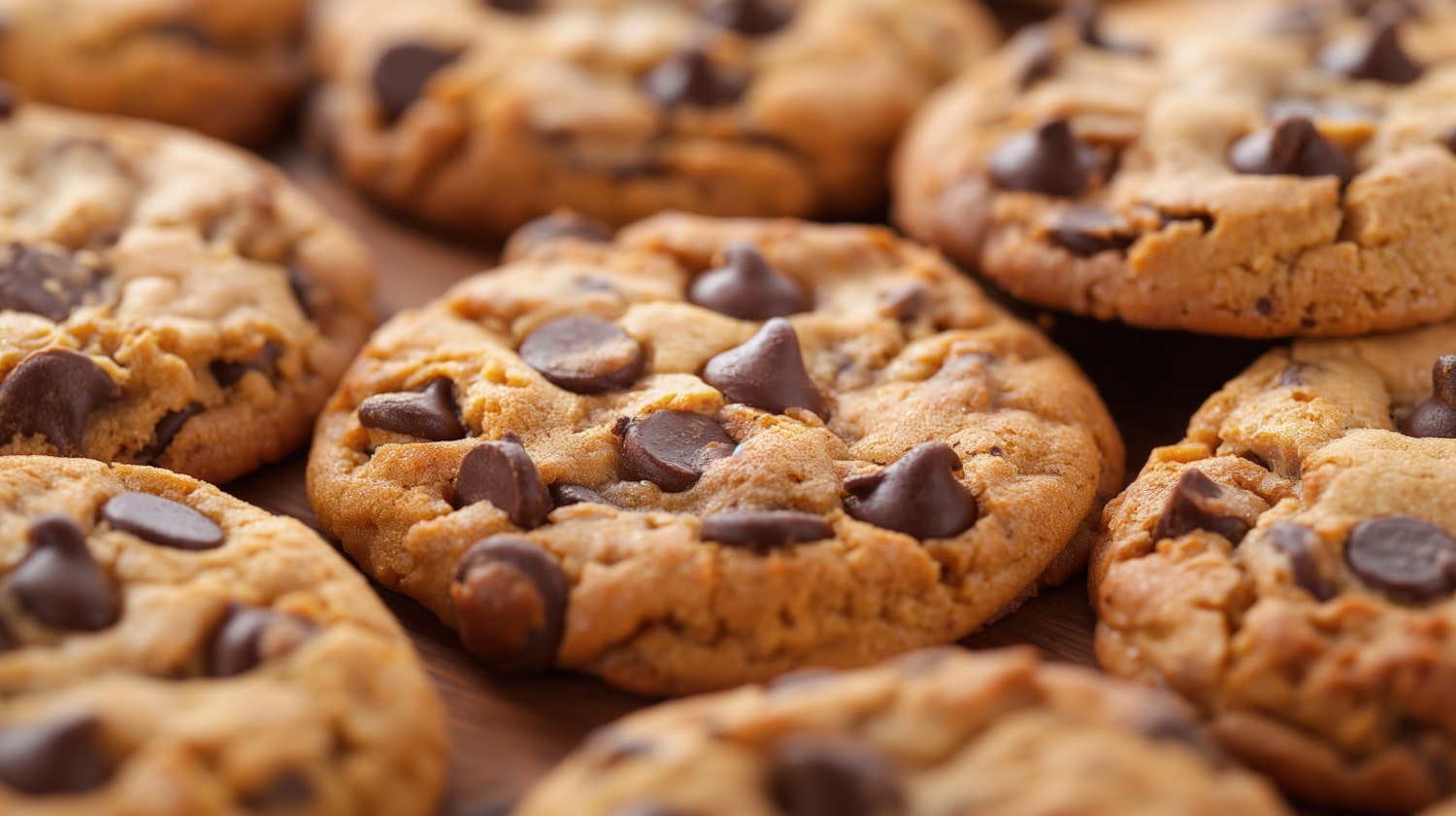 Close-up of freshly baked chocolate chip cookies with golden-brown edges and melted chocolate chunks.