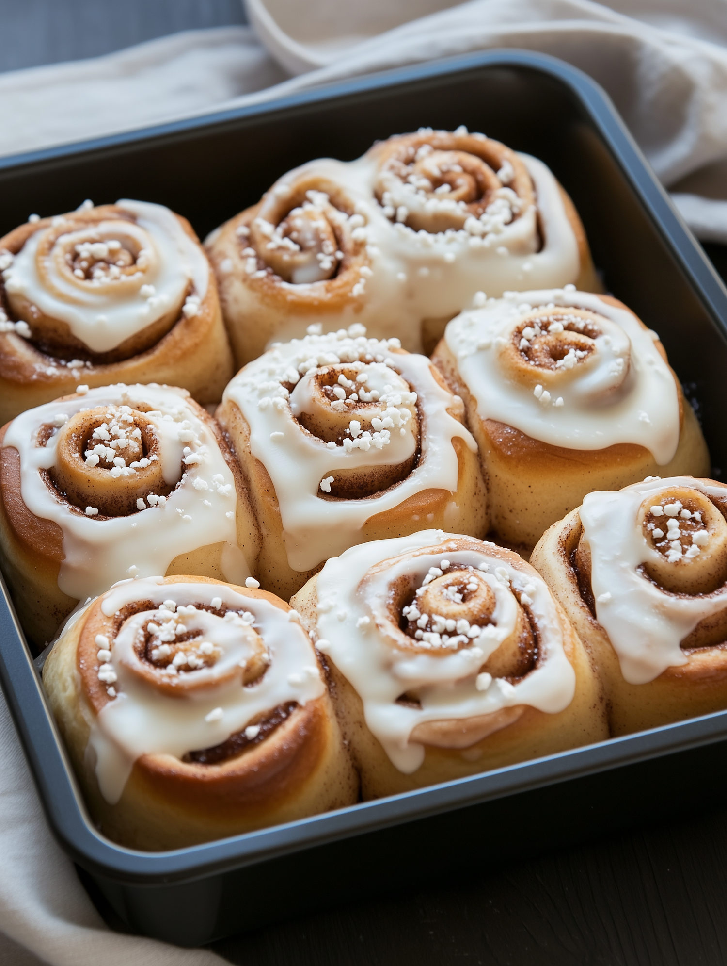 Freshly baked cinnamon rolls with creamy icing and sugar crystals in a square pan, perfect for a cozy kitchen setting.