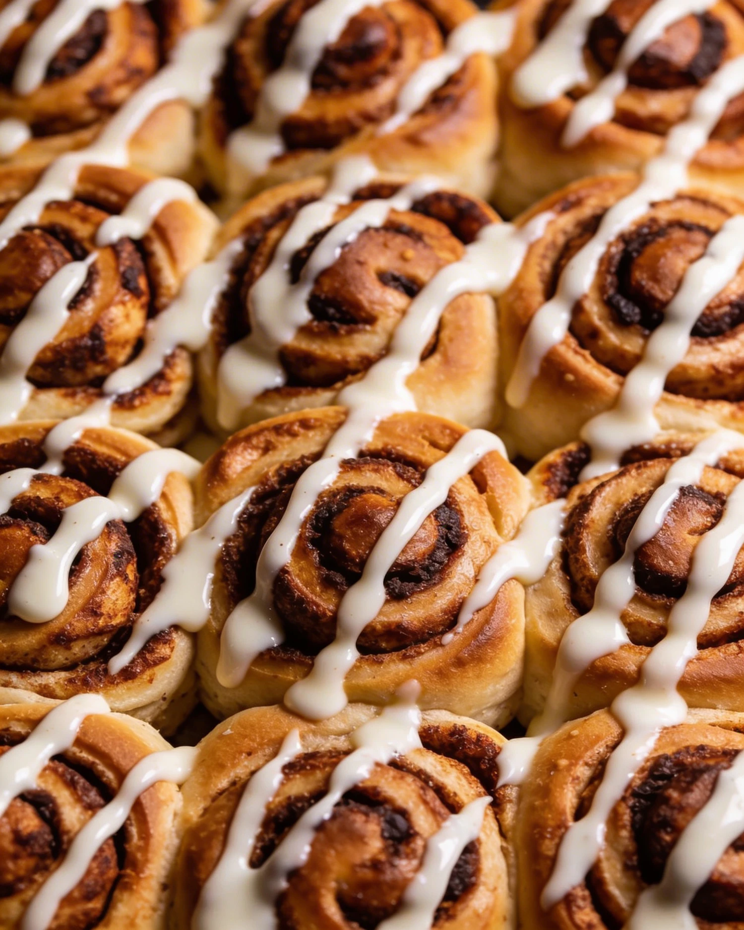 Extreme close-up overhead photograph of freshly baked cinnamon rolls packed tightly together in a baking tray, filling the entire frame edge to edge with no background visible. The rolls are pressed against each other, no gaps between them, a grid of soft golden spirals. Each roll is hyperrealistic, golden brown with deep caramelized crispy edges, visible tight spiral layers of soft pillowy dough, dark cinnamon filling visible between each fold, the dough is slightly puffed and uneven, each roll slightly different from the next. A generous drizzle of thick white cream cheese glaze is poured over the top of all the rolls — the glaze is opaque, white, dense and creamy, drizzled in irregular zigzag lines across the entire surface, pooling in the crevices between the rolls, some drips running down the sides of individual spirals, the glaze is still fresh and glossy, slightly warm and melting. The color contrast is rich — deep golden brown dough, dark cinnamon filling, bright white glaze. Warm tones, the golden color of the dough is saturated and appetizing, slightly caramelized and burnished. Soft even diffused lighting from above, no sharp shadows, the light catches the glossy surface of the glaze. The entire frame is filled with rolls, no plate visible, no tray edge visible, no background, no surface, just an uninterrupted sea of glazed cinnamon rolls. Shot on Canon EOS R5 with 50mm f/1.8 lens, subtle film grain, warm saturated color grading. --no dark background, no single roll, no plate, no table, no fabric, no hands, no cutlery, no text, no dry rolls without glaze, no smooth perfect rolls, no artificial look, no wide shot, no negative space