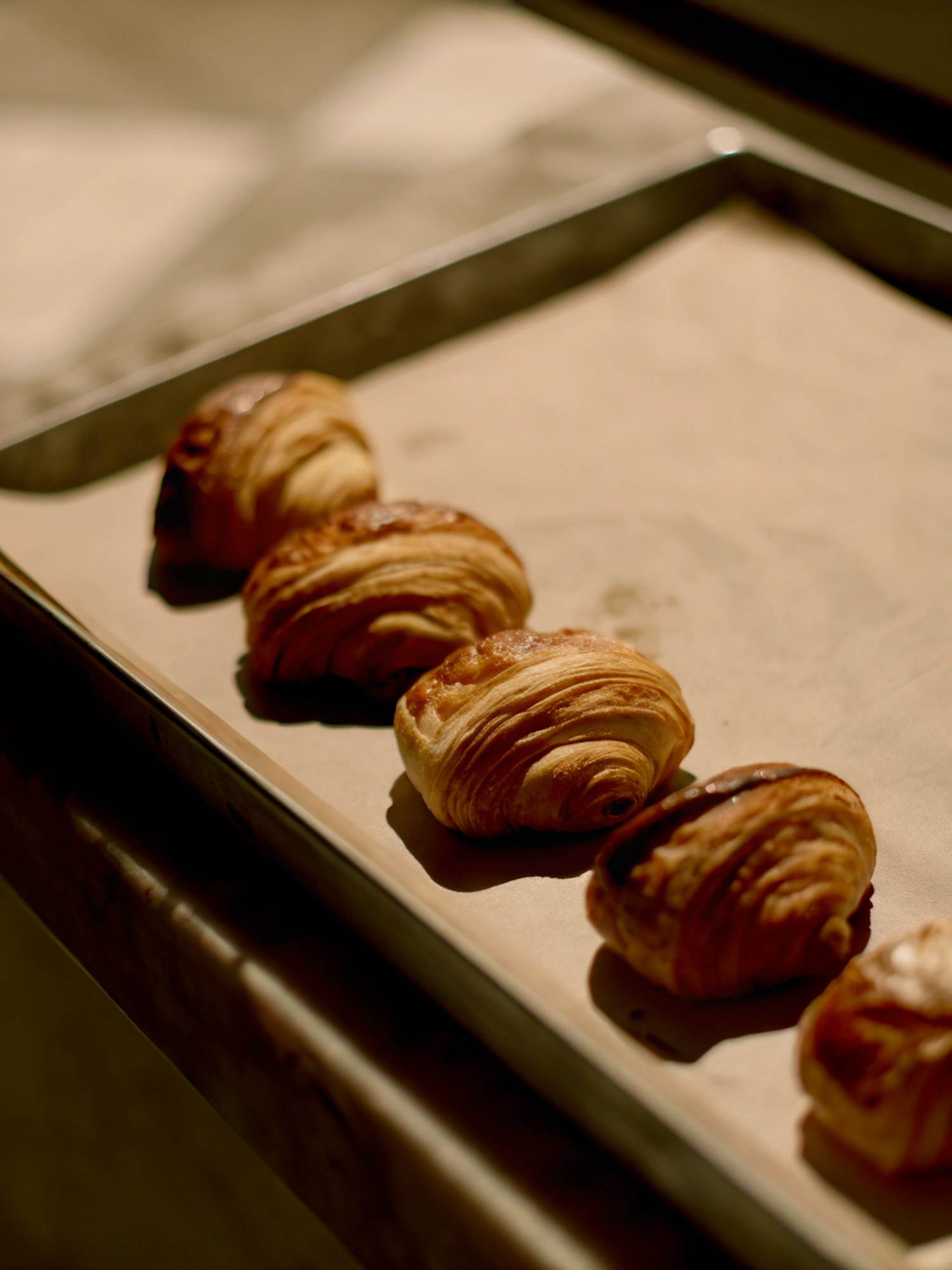 Golden, flaky pain au chocolat pastries on a parchment-lined tray, with warm lighting highlighting their crisp layers.