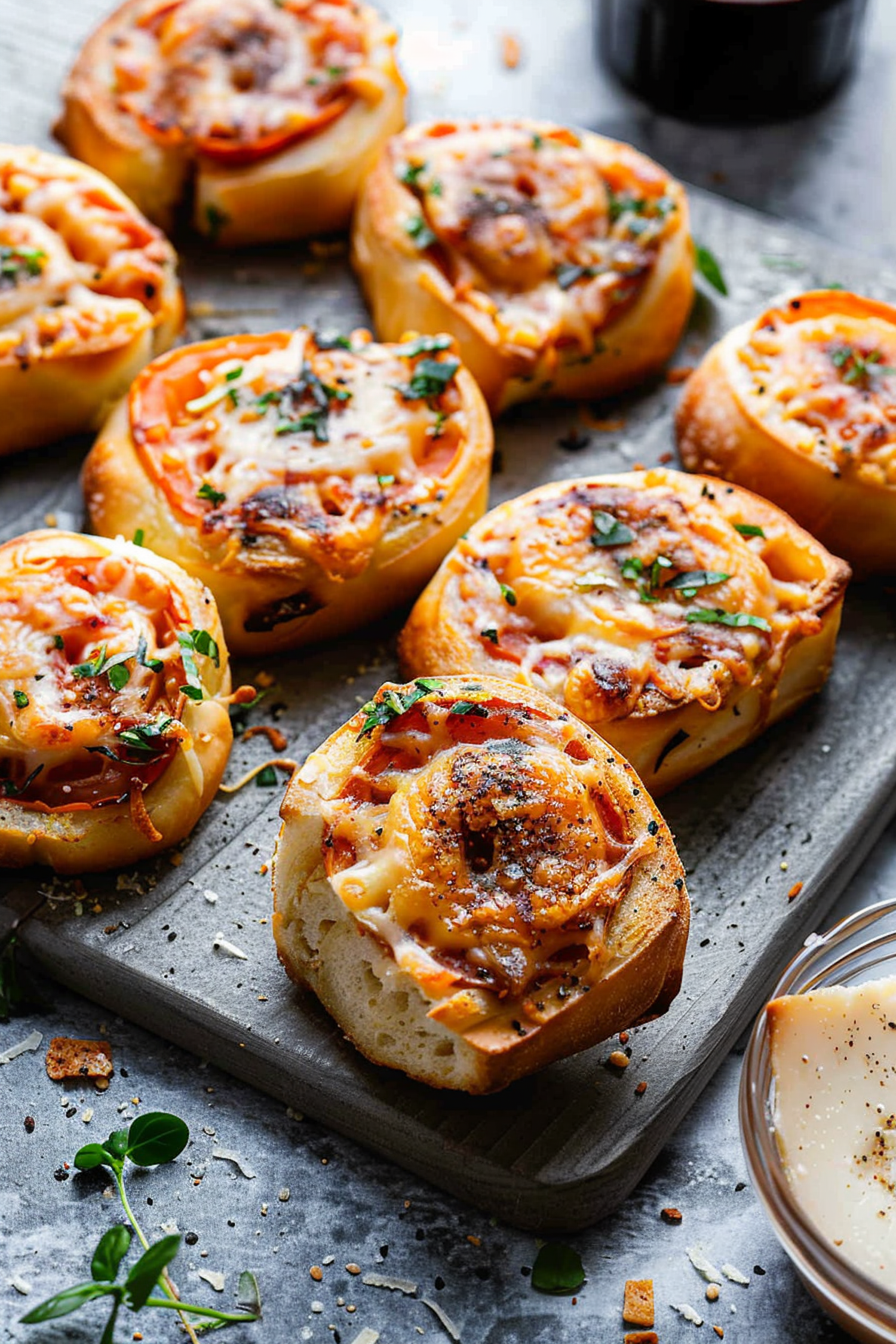 Deliciously baked pizza rolls topped with melted cheese and herbs on a rustic board, perfect for a savory snack.