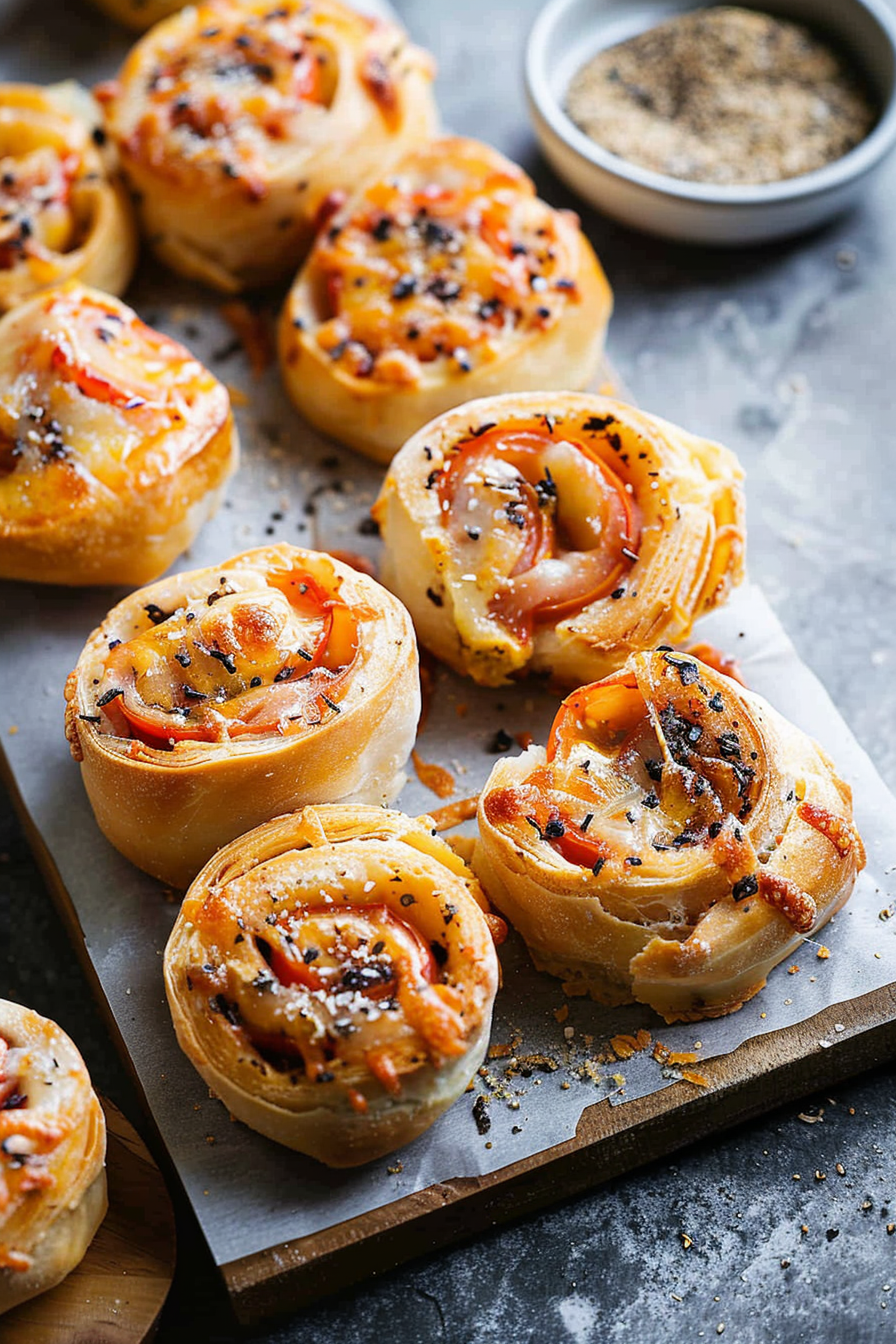 Delicious golden-brown pizza rolls with cheese and pepperoni, topped with sesame seeds, on a wooden board with spices.