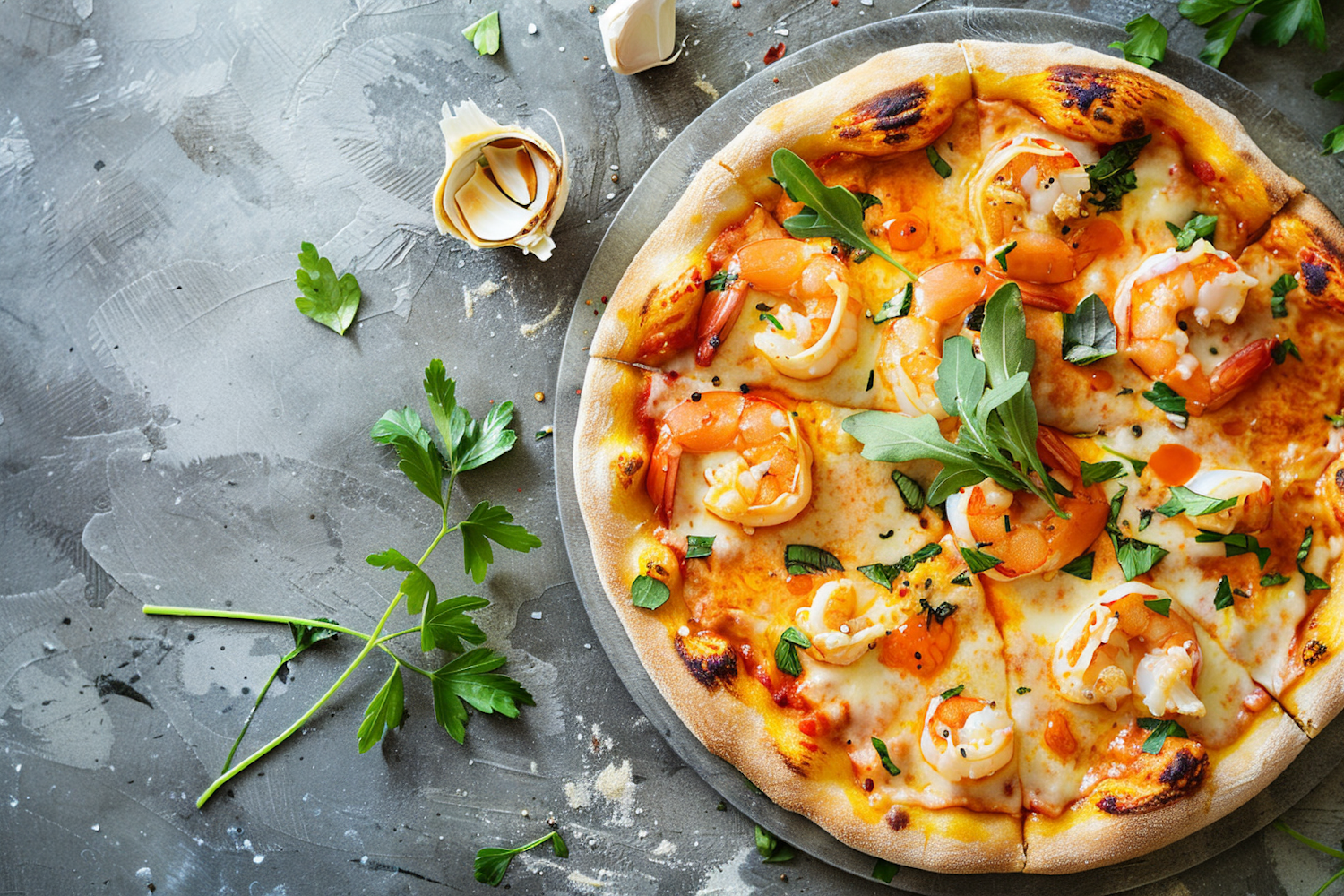 Gourmet shrimp pizza with arugula and herbs on a rustic surface, featuring golden crust and melted cheese.