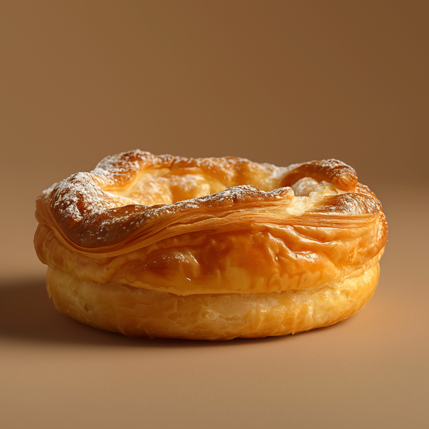 Golden-brown layered pastry with powdered sugar on a warm background, showcasing its flaky texture and rich appearance.