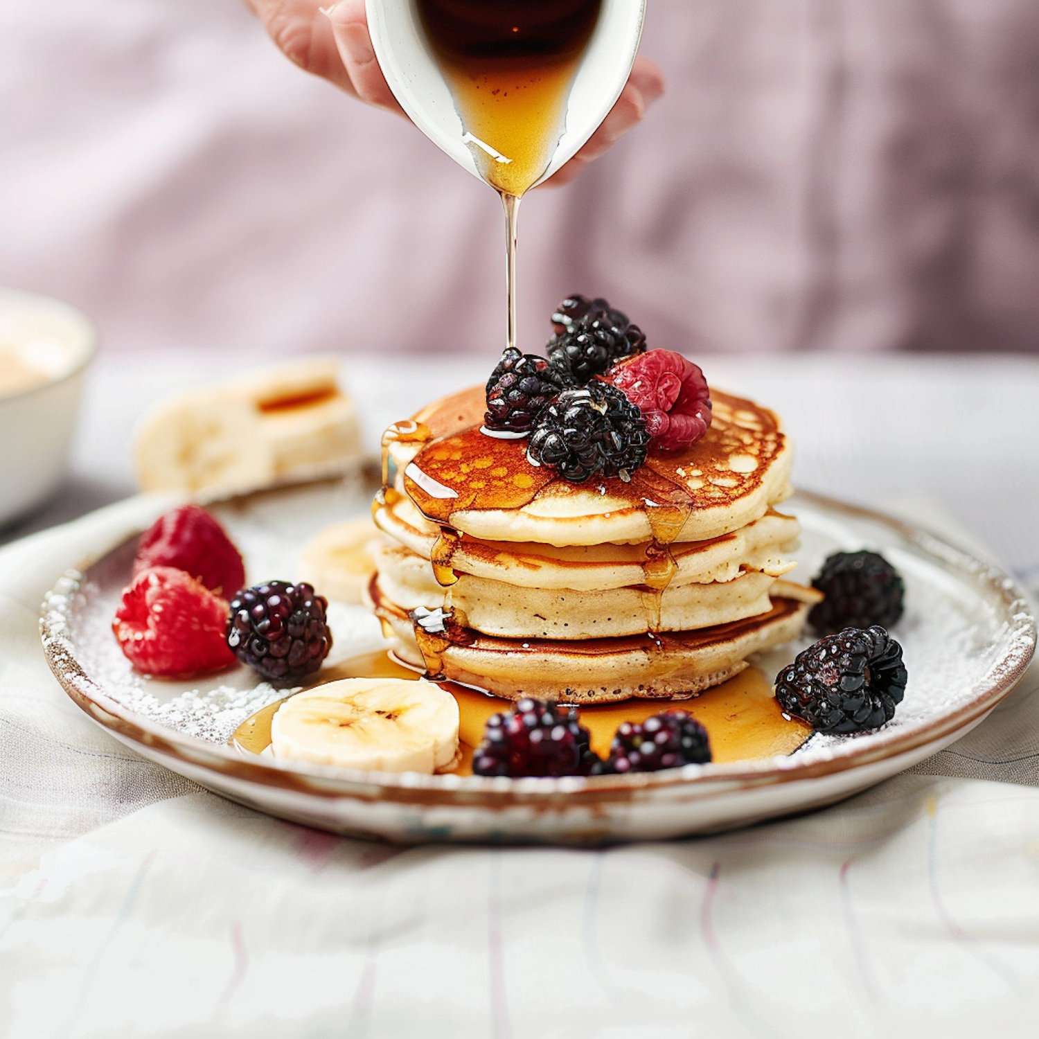 Fluffy pancakes topped with fresh berries and bananas, drizzled with golden maple syrup for a perfect breakfast treat.