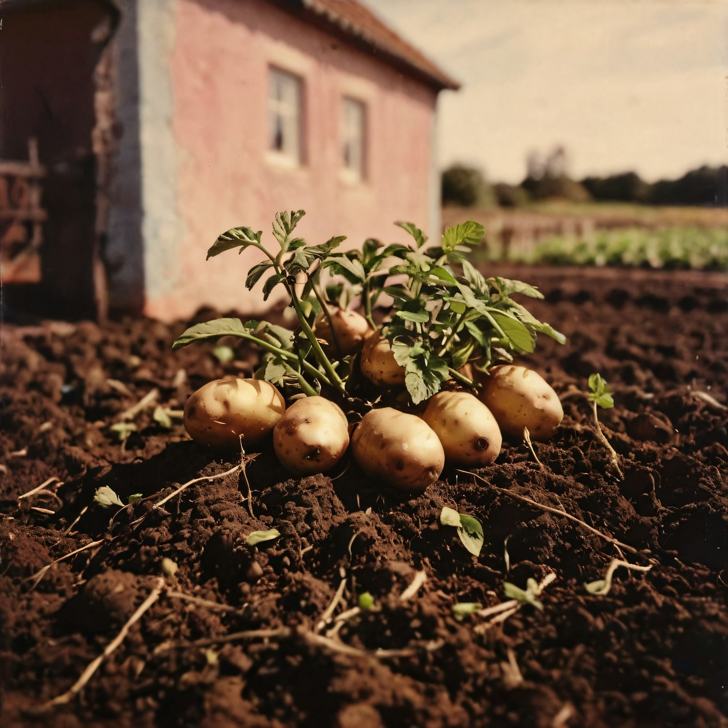 Freshly harvested potatoes on rich soil with a rustic building in the background, capturing rural tranquility and agricultural abundance.