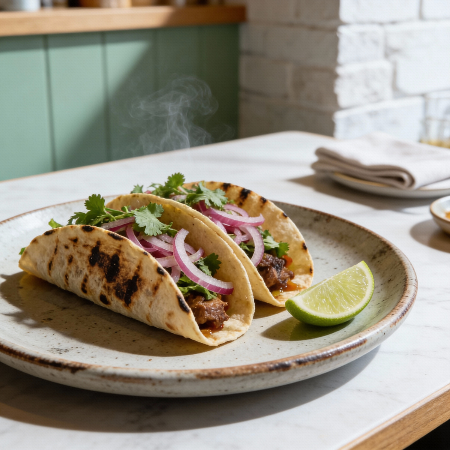 Two delicious tacos with meat, cilantro, and onions on a plate, served with a lime wedge, in a cozy dining setting.