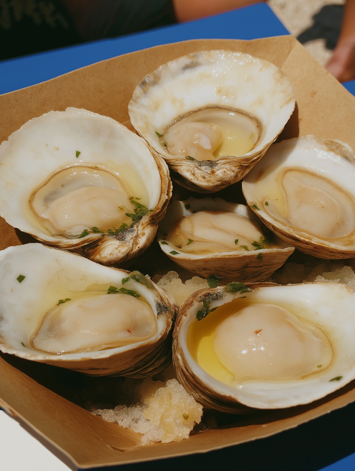 Fresh oysters on ice with lemon and herbs in a cardboard tray, perfect for a seafood lover's delight.