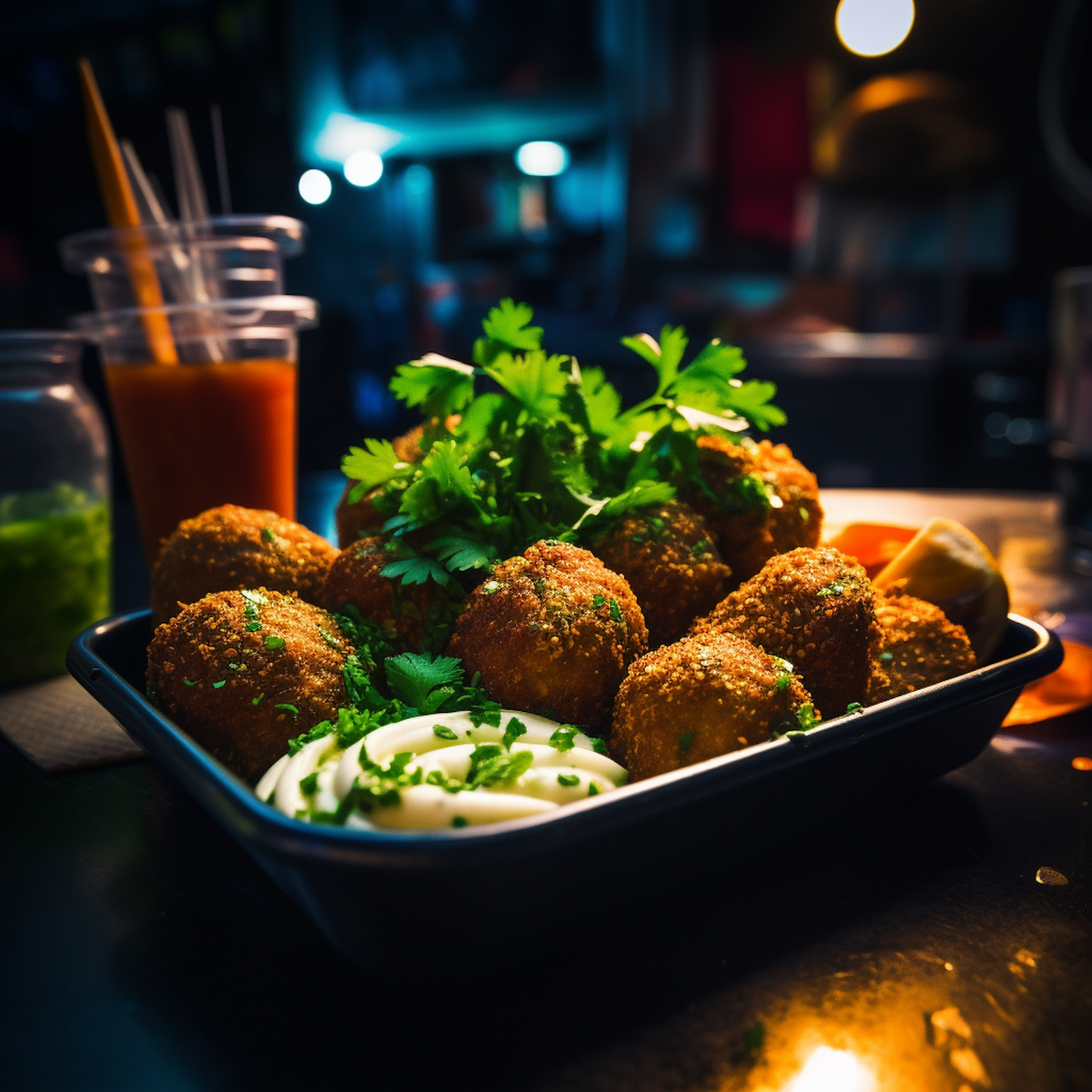 Delicious golden croquettes with cilantro and creamy sauce in a cozy restaurant setting.