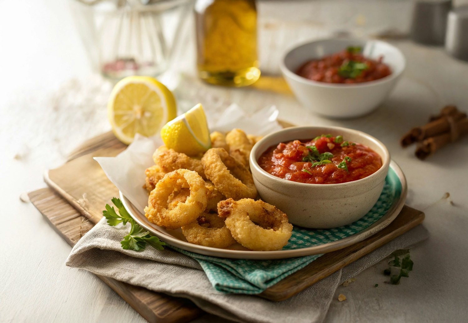 Crispy fried calamari with marinara sauce and lemon wedges, served on a rustic plate with a cozy, inviting presentation.