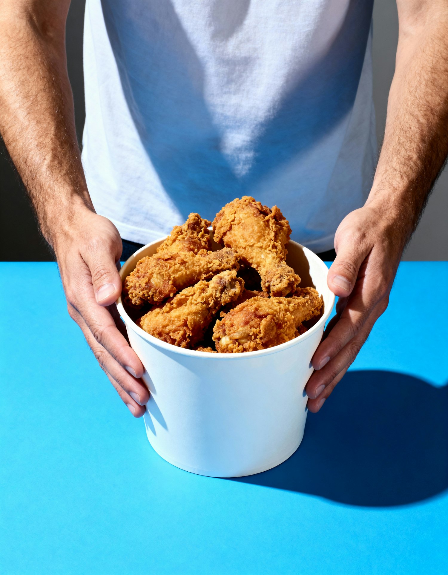 A bucket of crispy fried chicken held by hands, set against a vibrant blue background, showcasing the golden texture of the food.