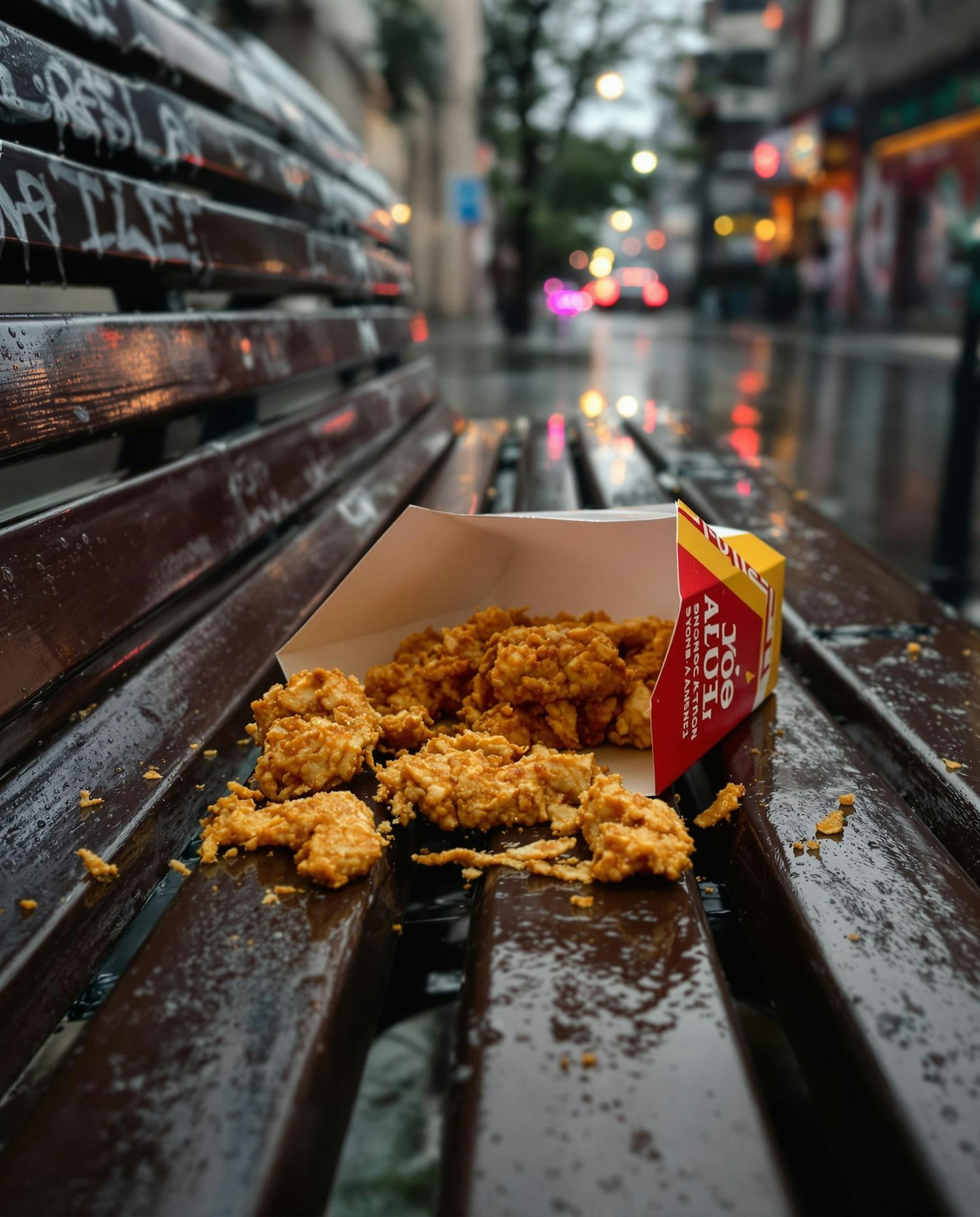 A fast-food chicken box abandoned on a wet bench, pieces of fried food soaked and scattered. Rain droplets on packaging, urban background blurred. Gritty, raw, and unglamorous.