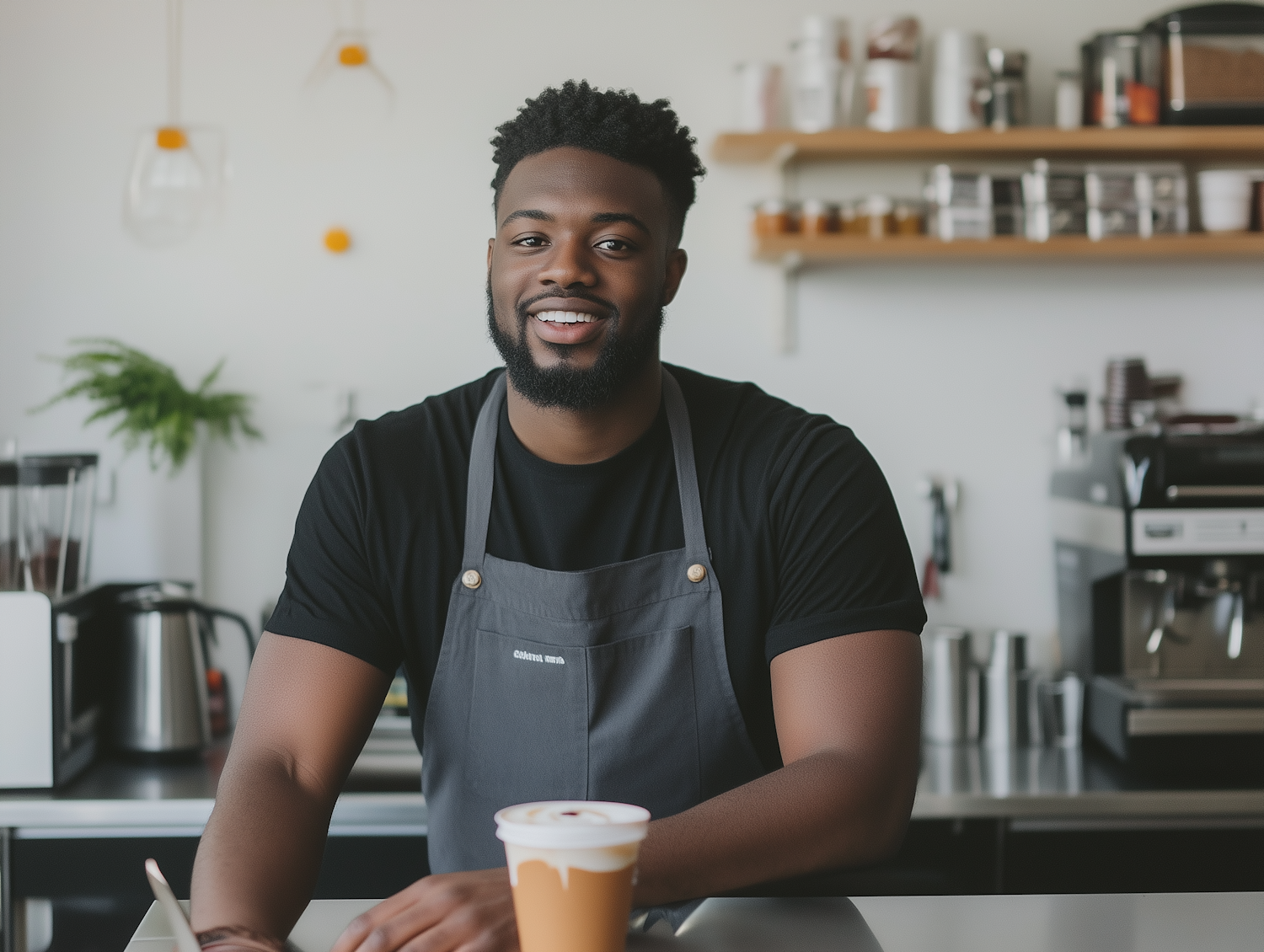 Smiling barista in a modern coffee shop, wearing a gray apron and black t-shirt, with coffee equipment in the background.