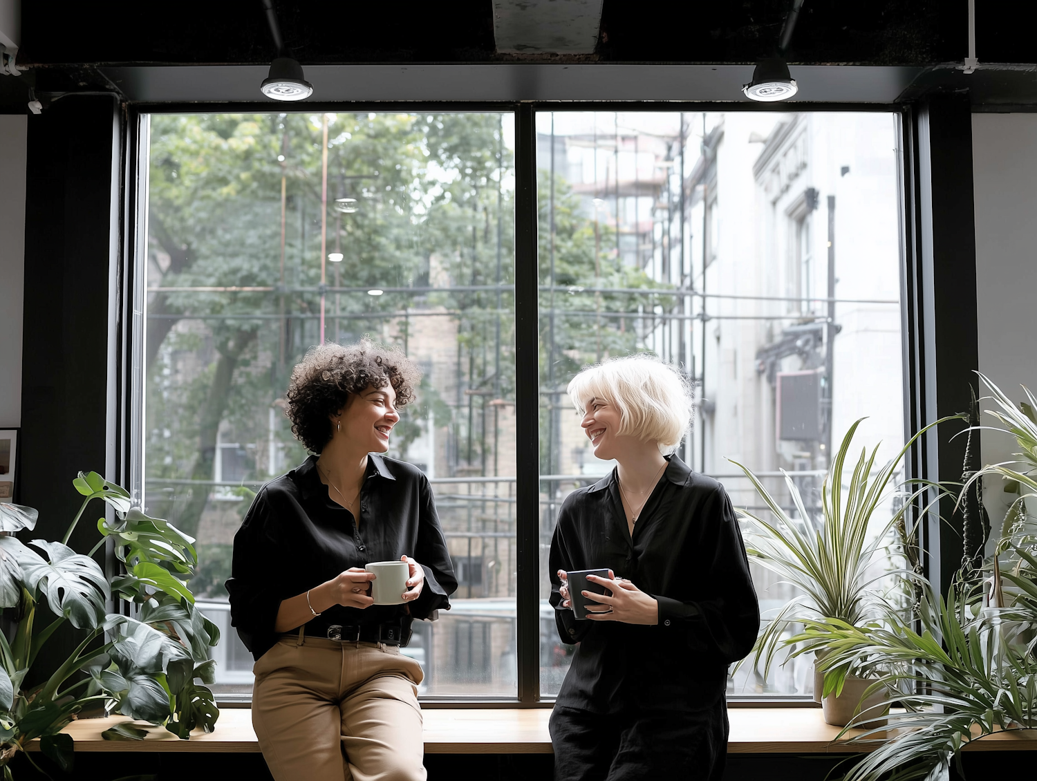 Two women enjoying coffee and a friendly chat by a large window, surrounded by lush indoor plants and a cityscape view.