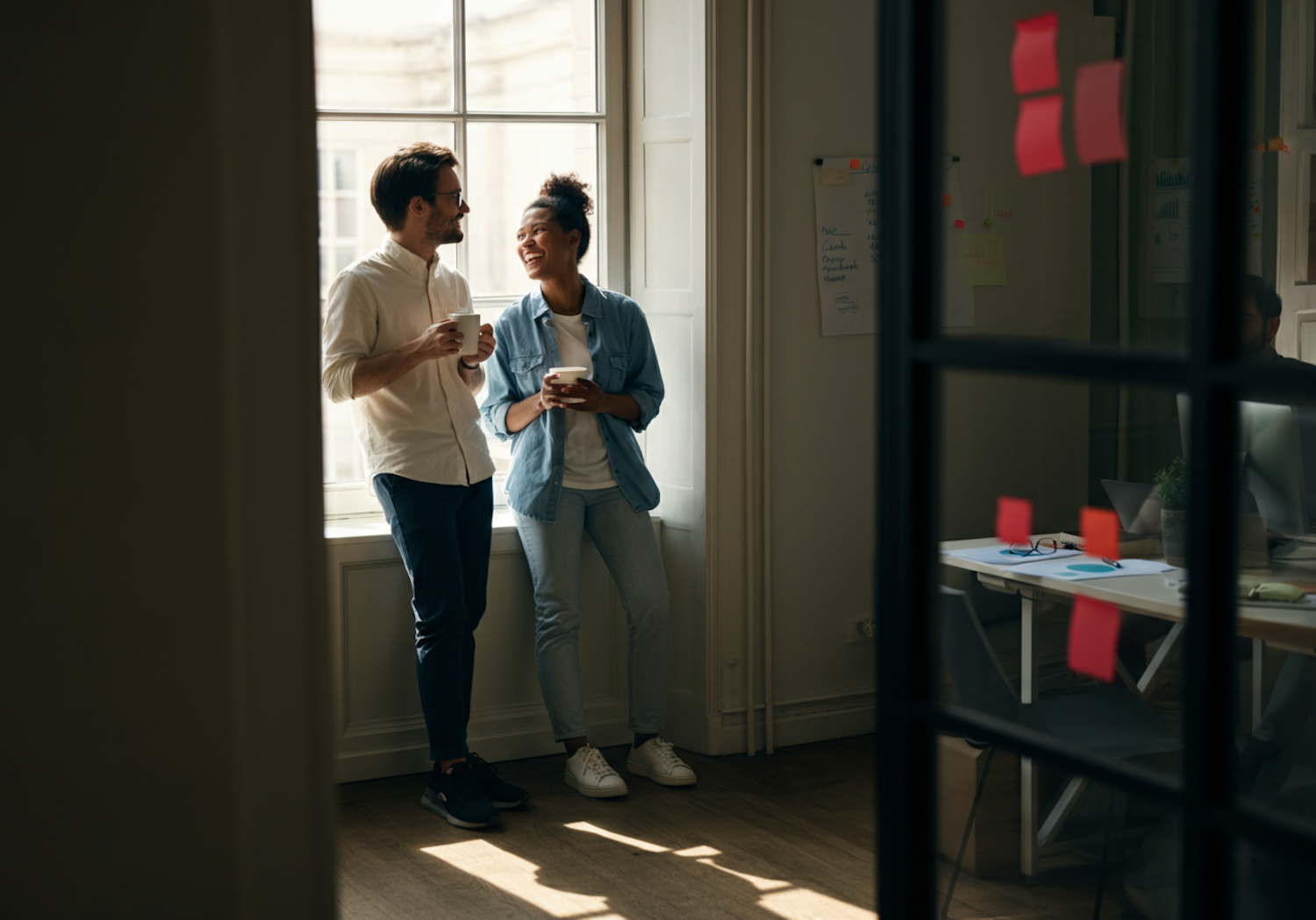 Two colleagues enjoy a coffee break by a sunlit window, sharing a friendly conversation in a modern office setting.