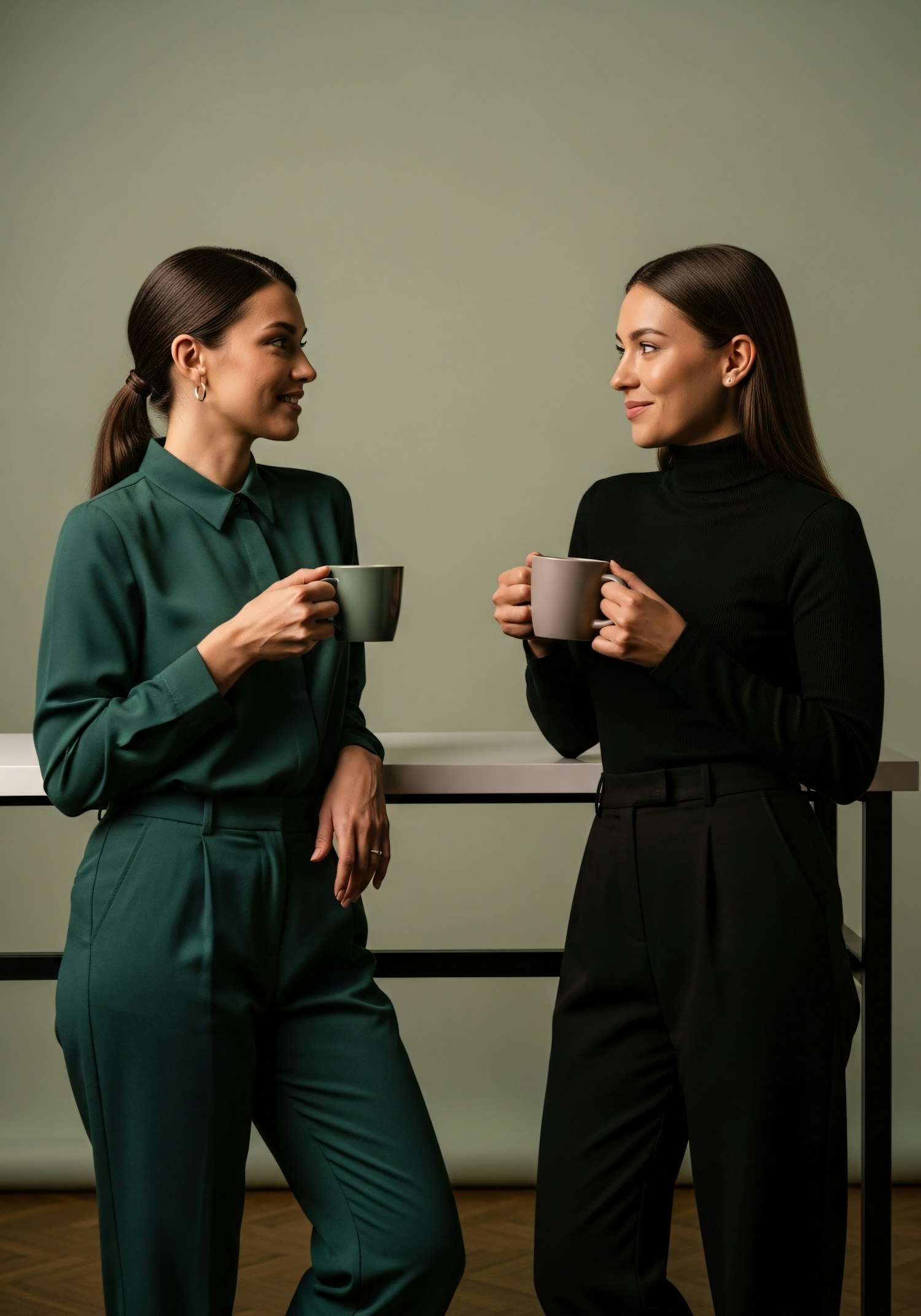 Two women in stylish outfits enjoy a conversation while holding mugs, set against a minimalistic green background.