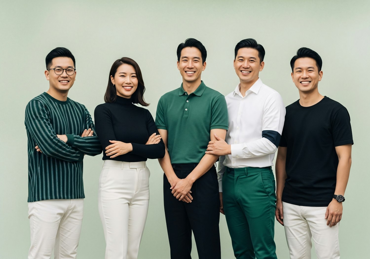A group of five people smiling warmly, dressed in casual attire with green, black, and white tones, standing against a light green background.