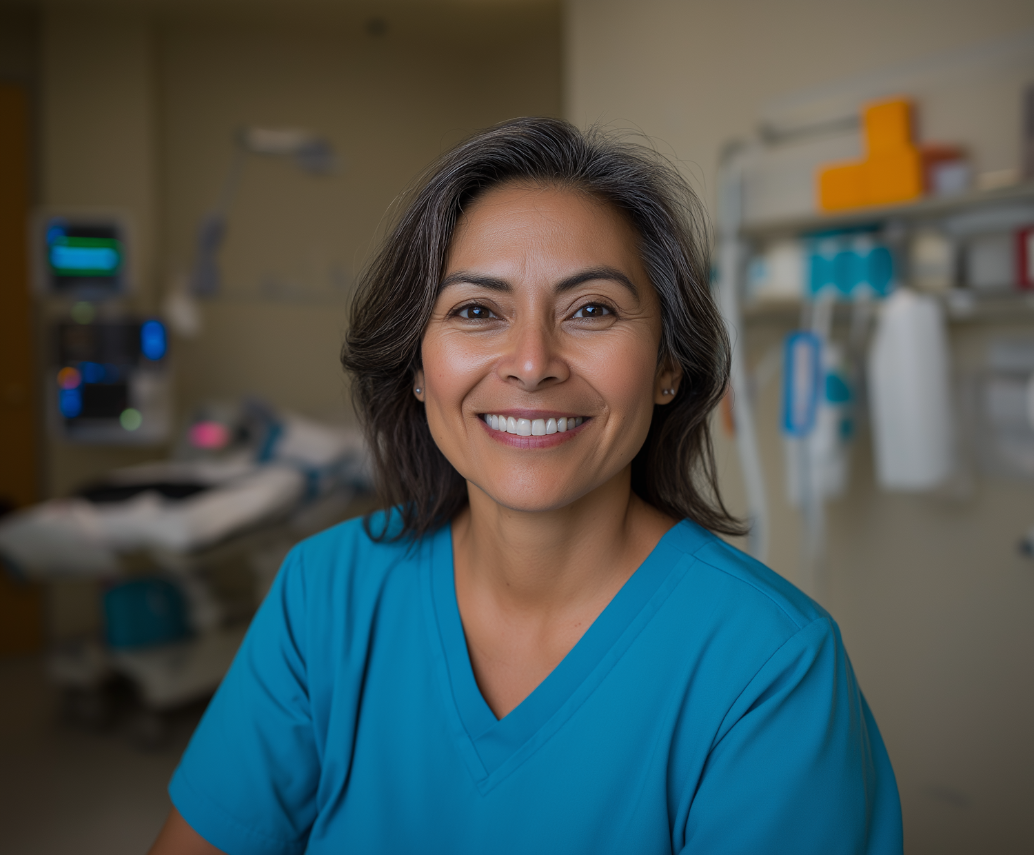 Smiling healthcare professional in blue scrubs in a hospital room, conveying warmth and professionalism.