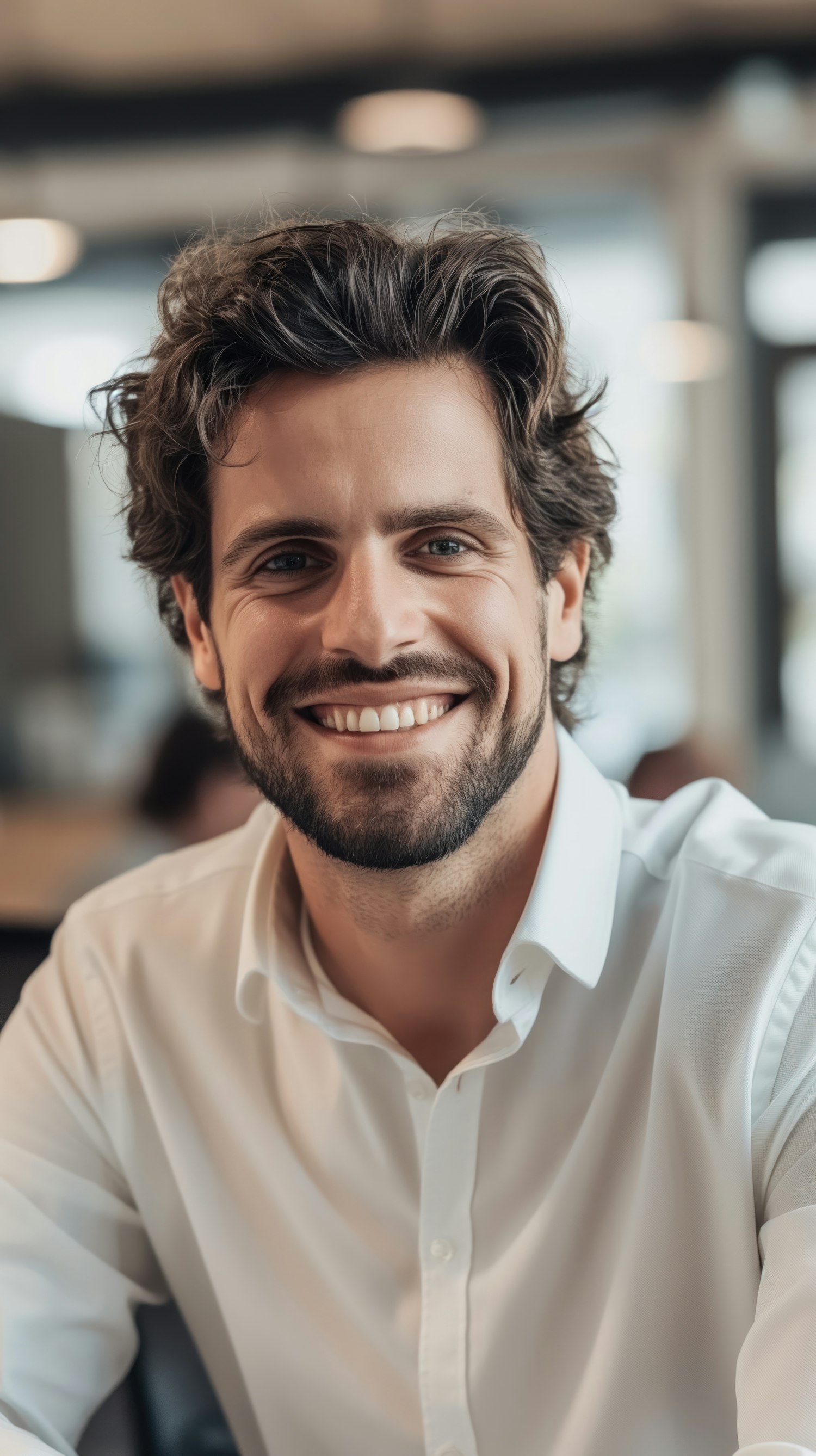 Smiling man with wavy brown hair and beard in a white shirt, exuding warmth and confidence in a softly blurred indoor setting.
