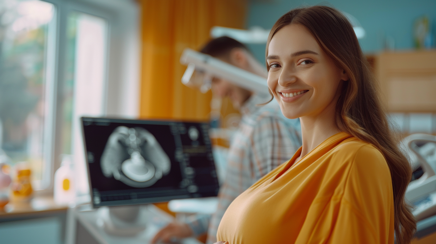 Pregnant woman smiling during an ultrasound check-up, with a supportive partner in the background. Bright and cheerful atmosphere.