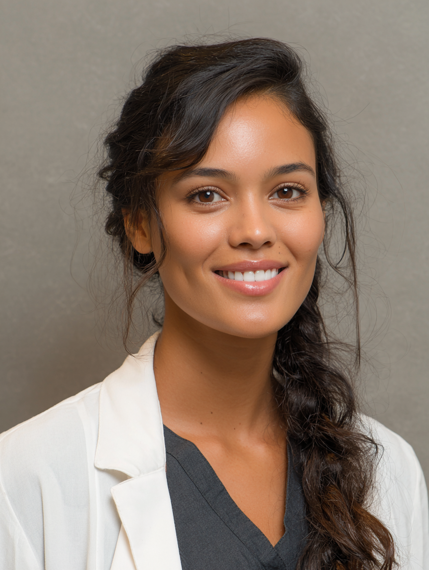 A professional woman with a warm smile, wearing a white lab coat and dark gray top, set against a neutral gray background.