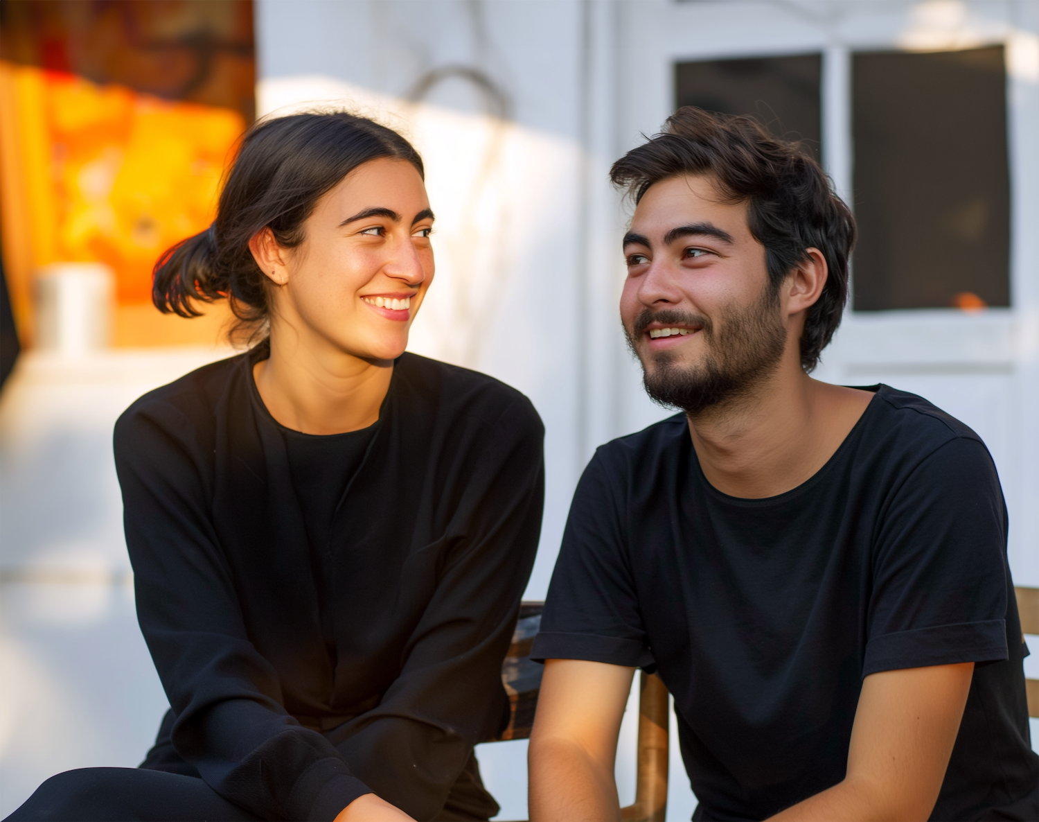 A young couple in black clothing share a warm smile in a casual outdoor setting with soft lighting.