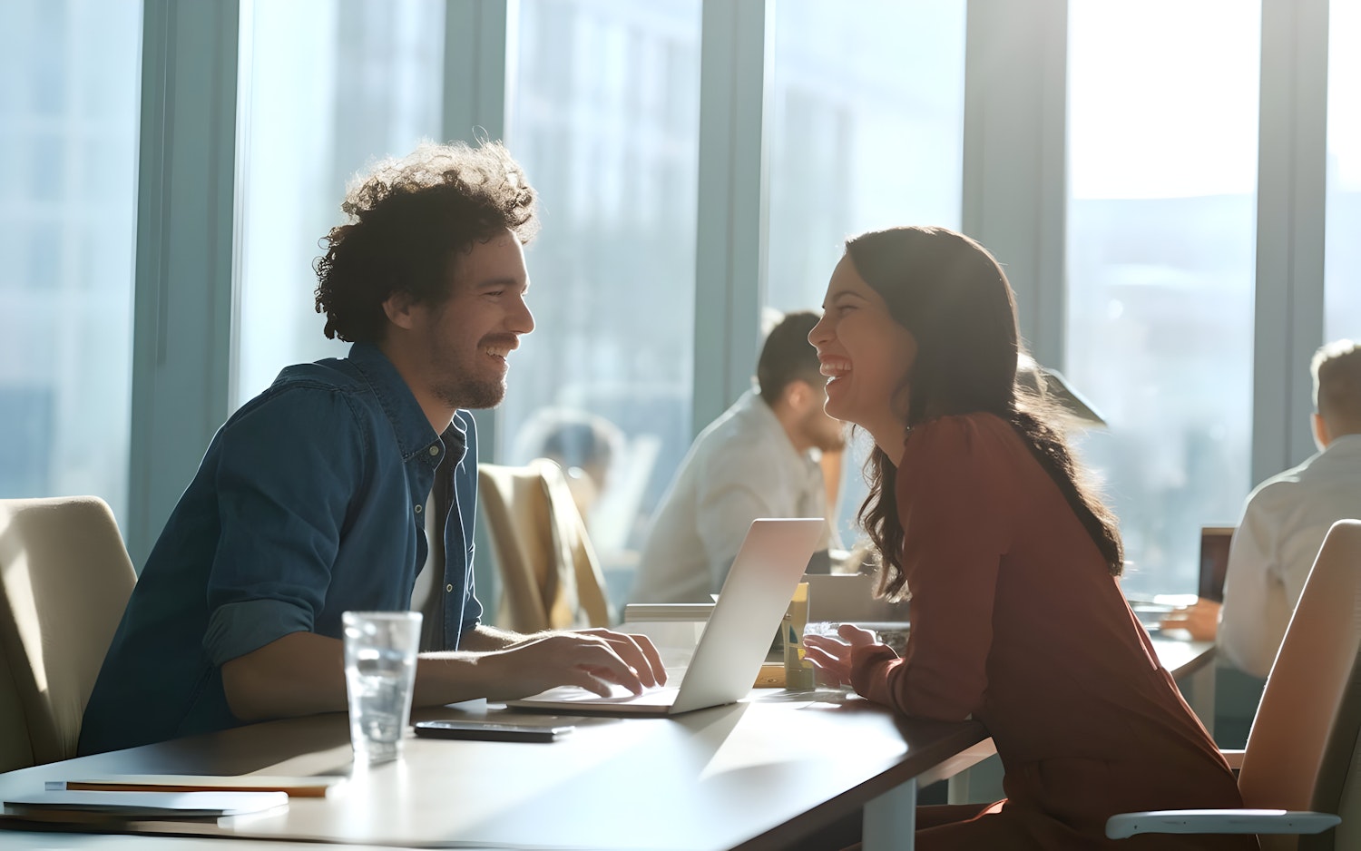 Two colleagues share a laugh in a bright office, with laptops and natural light creating a warm, collaborative vibe.
