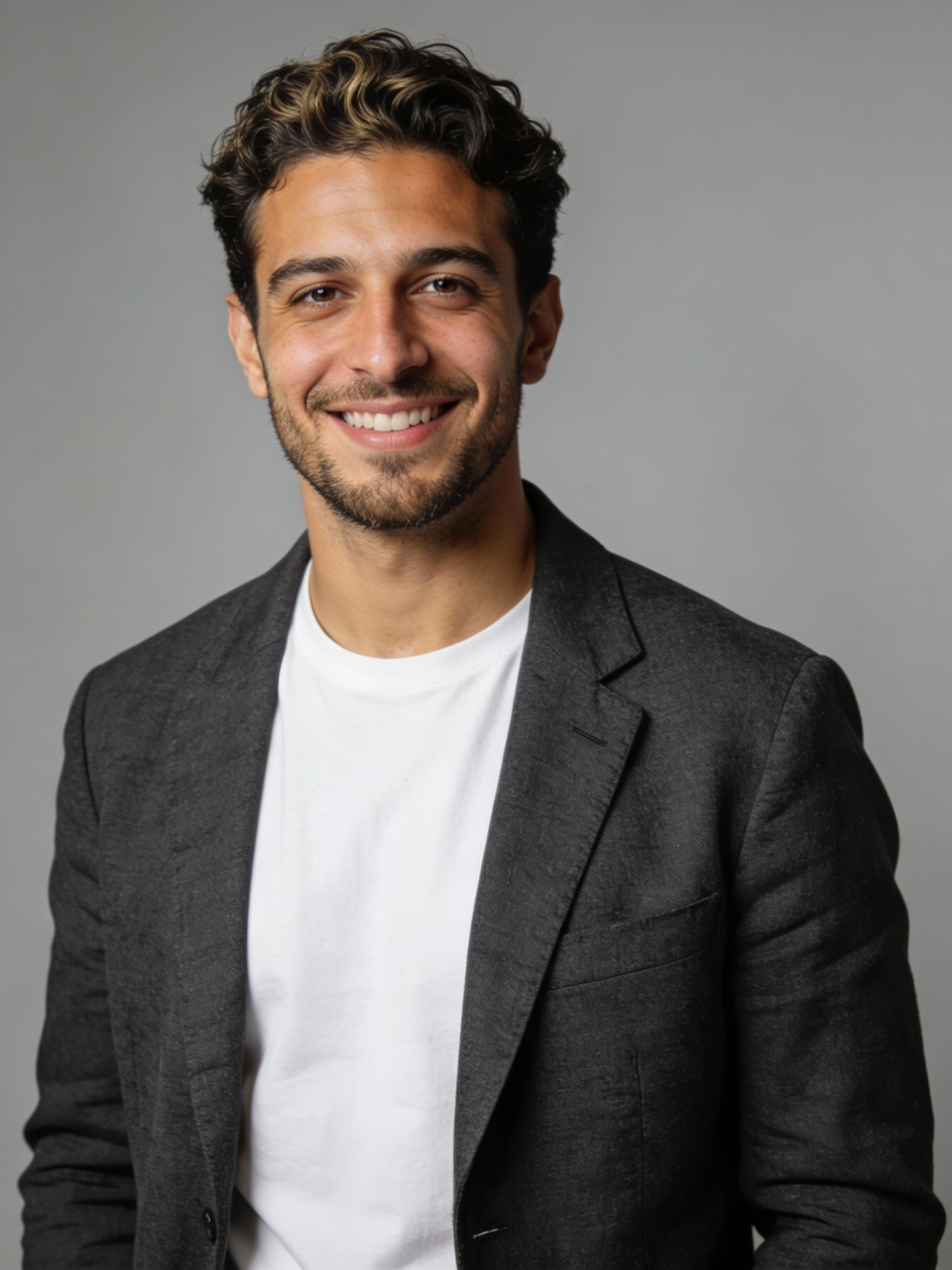 Studio portrait of a Lebanese male startup founder, age 31; light olive skin, neutral-warm undertone; short dark wavy hair, styled with light volume; trimmed short beard; dark gray unstructured blazer over a plain white t-shirt; neutral mid-gray seamless backdrop; Rembrandt lighting with soft fill; 105 mm macro-sharp. Expression: optimistic and driven, easy natural smile. Framing: portrait orientation, 3:4 ratio; mid-chest-up composition. Subject centered in frame, camera at eye level, facing directly toward the camera (front view). Full head and hair completely inside the frame with a little space above; both shoulders visible, no cropping at the top or sides. Neutral studio composition, no props.