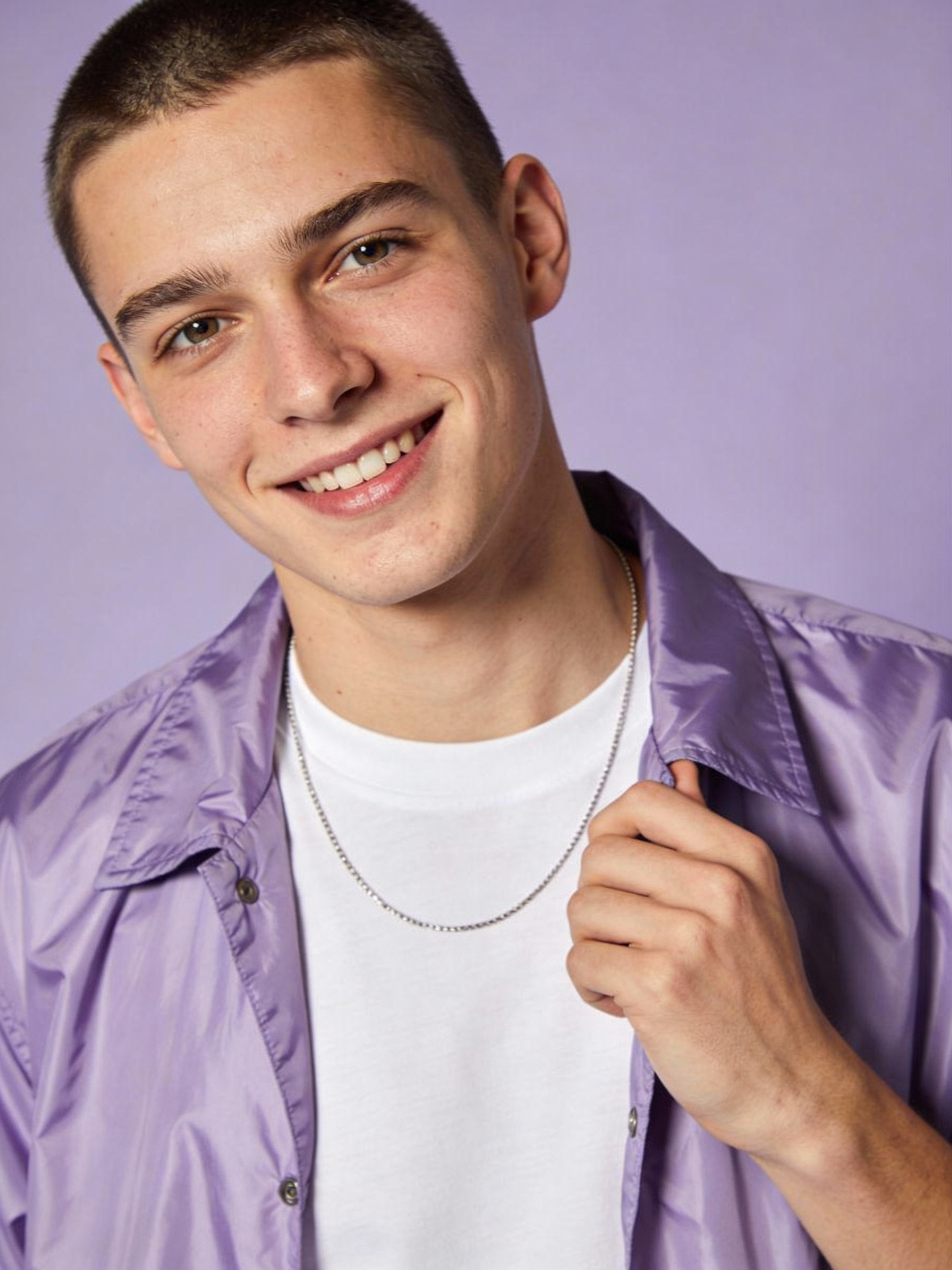 A young man in a purple shirt and white tee smiles warmly against a lavender background, exuding a casual and friendly vibe.